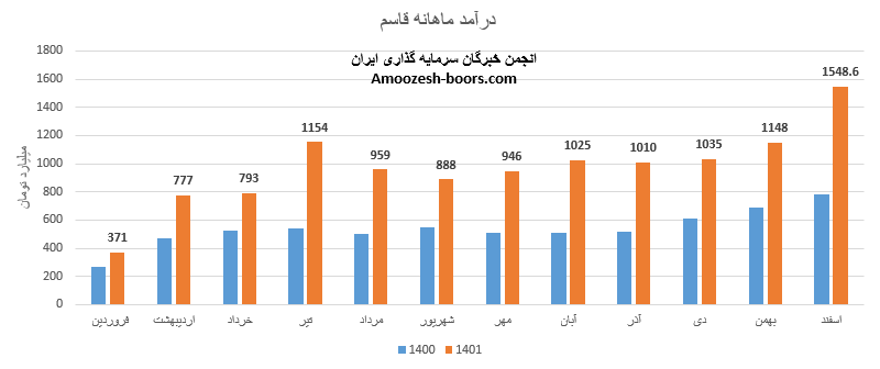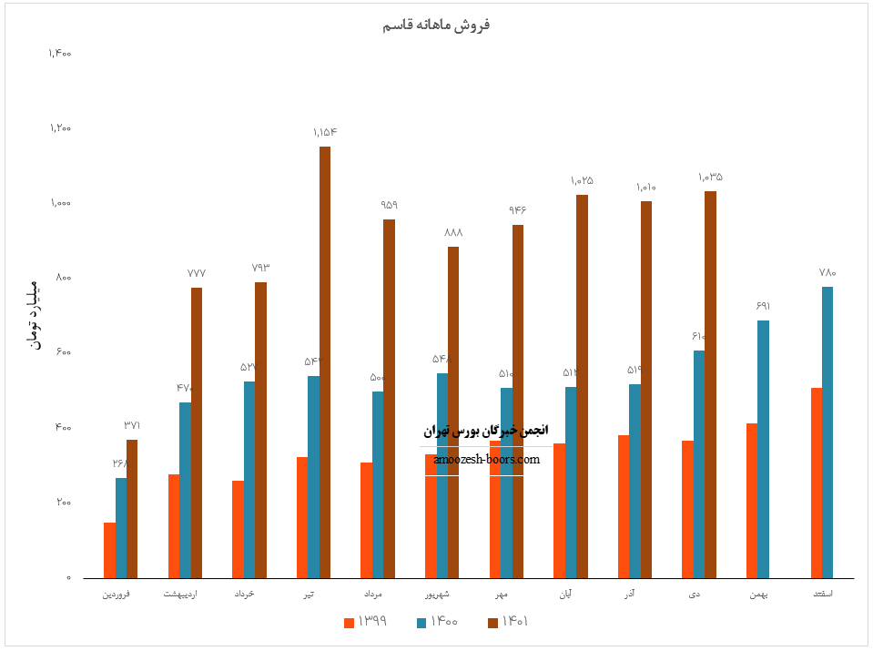 نماد قاسم (شرکت قاسم ایران) در بهمن ماه 1401 حدود مبلغ 1148 میلیارد تومان درآمد داشته که این میزان در مقایسه با ماه گذشته 11% و همچنین در مقایسه با مدت مشابه سال گذشته 66% رشد پیدا کرده است.