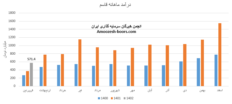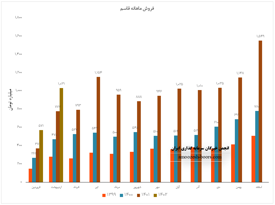 نماد قاسم (شرکت قاسم ایران) در اردیبهشت ماه سال 1402 حدود مبلغ 1031 میلیارد تومان درآمد داشته که این میزان در مقایسه با ماه گذشته 81% و همچنین در مقایسه با مدت مشابه سال گذشته 33% رشد پیدا کرده است.