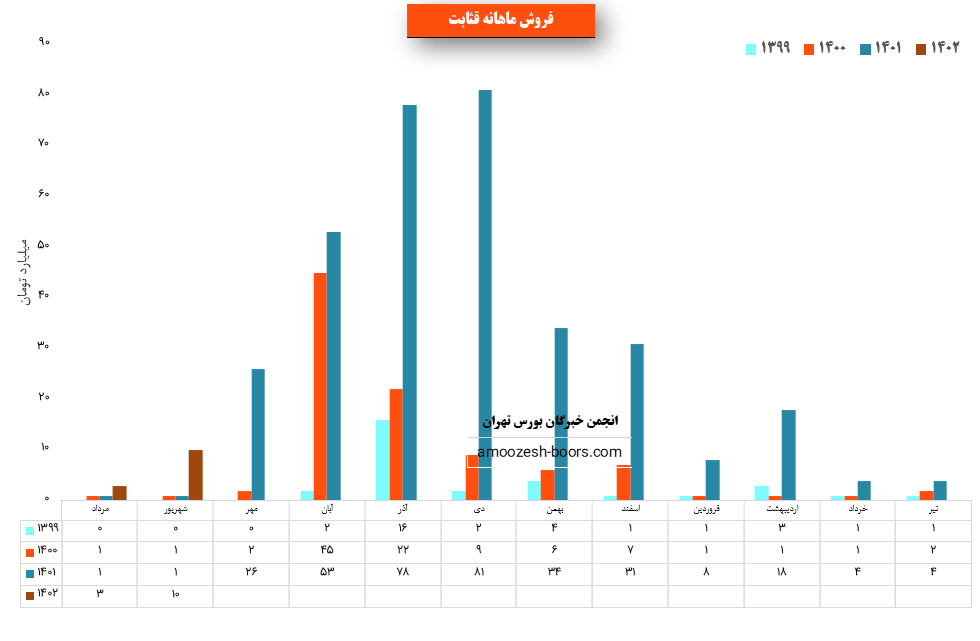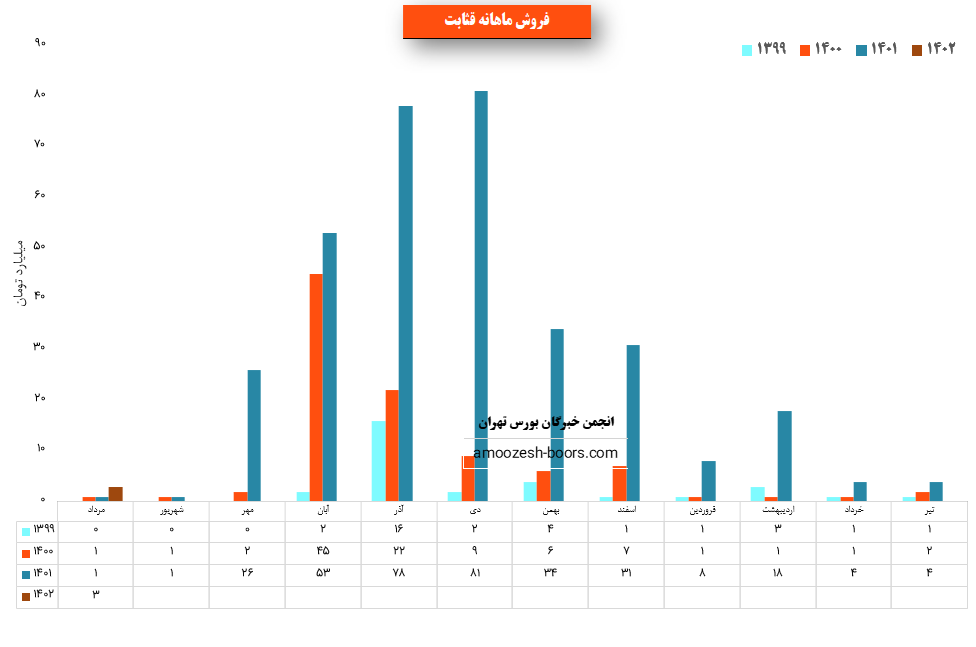 سهم قثابت در مرداد ماه حدود بیش از 447 تن از محصولات خود را به فروش رسانده که این میزان در مقایسه با حجم فروش ماه گذشته خود حدود 27% کاهش پیدا کرده است.