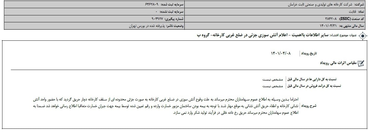 شرکت کارخانه های تولیدی و صنعتی ثابت خراسان (نماد قثابت) اعلام نمود به علت وقوع آتش سوزی در ضلع غربی کارخانه به صورت جزئی محدوده ای از سقف کارخانه دچار حریق گردید که با حضور واحد آتش نشانی کارخانه و اطفاء حریق آتش نشانی به موقع مهار شد و با توجه به بیمه بودن ساختمان مزبور خسارت وارده و رقم تعیین شده توسط بیمه جهت جبران خسارت متعاقبا اطلاع رسانی خواهد شد ضمنا به اطلاع میرساند حریق رخ داده خللی در فرآیند تولید شکر وارد نمیسازد.