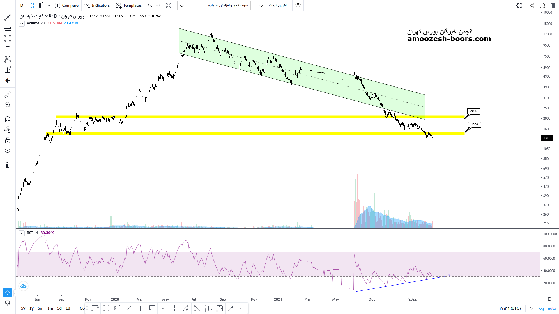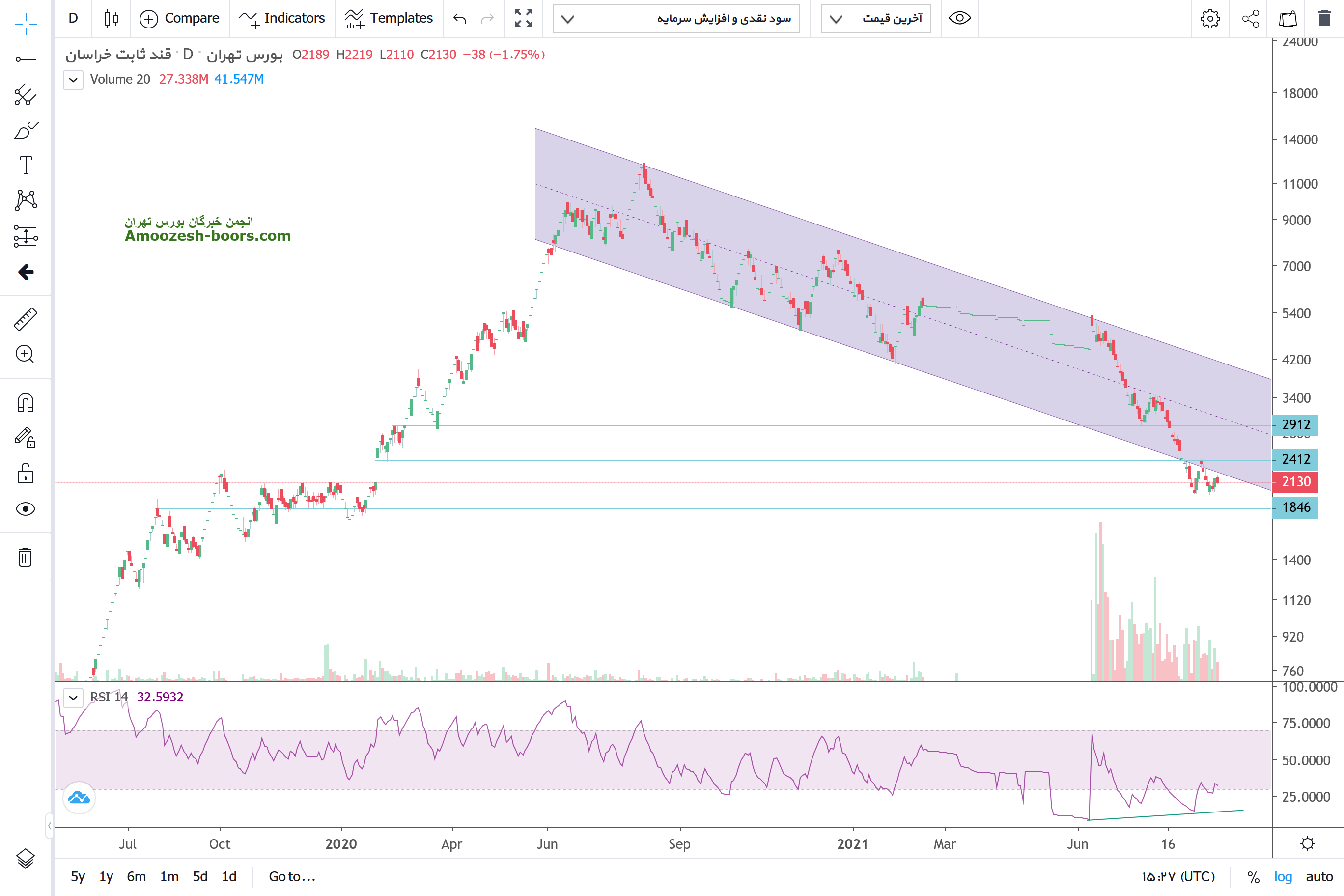 قیمت سهم قثابت یک کانال نزولی بلند مدت خود را شکسته و با ایجاد واگرایی مثبت در حال تست این محدوده میباشد در صورتیکه خریداران قدرت باز پس گیری کانال را پس گیرند تارگت 3000 در نظر گرفته میشود در غیر اینصورت ، قیمت میتواند تا محدوده حمایتی 1750 به اصلاح قیمتی خود ادامه دهد و در صورت حفظ کف قیمتی 2000 سیگنال ساید تا مقاومت 2400 محتمل میباشد .