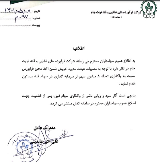 | نام شرکت | شرکت فرآورده های غذایی و قند تربت جام |