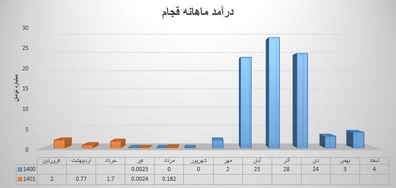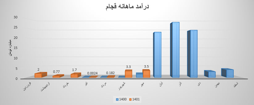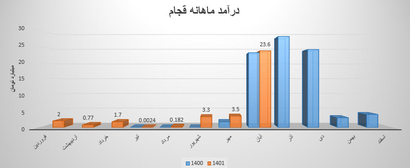 نماد قجام در عملکرد هشتمین ماه از23.6 میلیارد تومانی دست یافت که این رقم نسبت به میانگین ماه های قبل 46.9% افزایش و نسبت به دوره 1 ماهه مشابه سال قبل 1% افزایش و نسبت به ماه قبل 574% افزایش درآمد داشته است.
