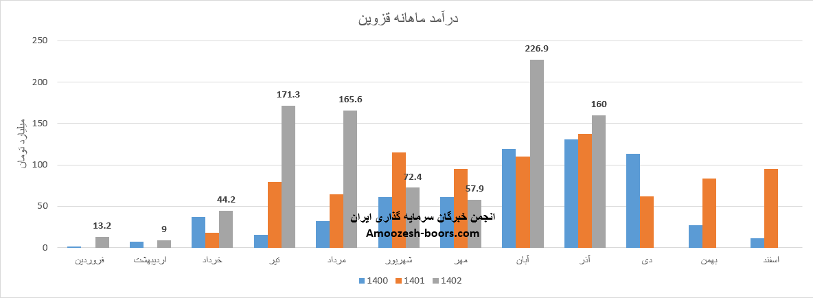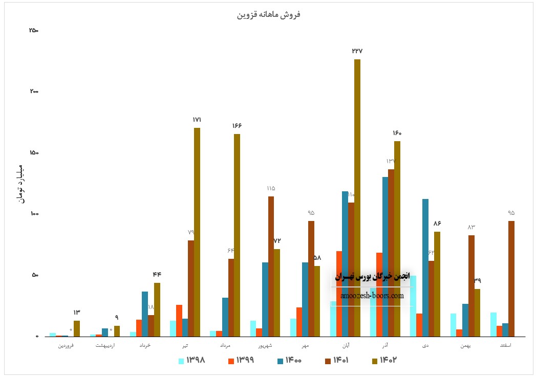 فروش آذر ماه سال 1402 سهم قزوین 160 میلیارد تومان گزارش شده است، تغییرات درآمدی قزوین به شرح زیر میباشد:
