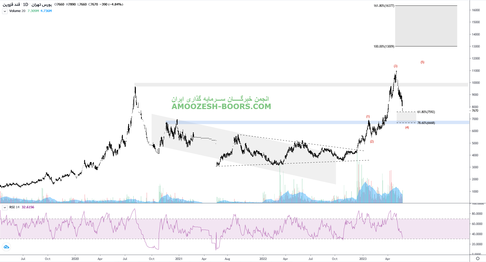 قیمت نماد قزوین بعد از برخورد با سقف کانال صعودی و شروع اصلاح، در حال حاضر در محدوده 6400 ریال میباشد، مقاومت سهم قزوین 10000 ریال در نظر گرفته خواهد شد، همچنین در صورت از دست رفتن محدوده حمایتی ذکر شده، حمایت بعدی قزوین 5800 ریال خواهد بود.