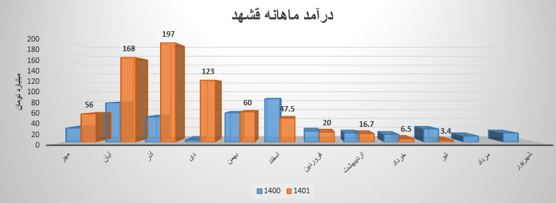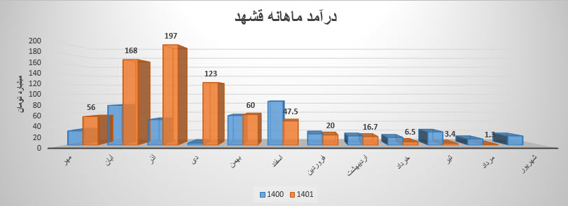 نماد قشهد در دوره یک ماهه منتهی به 31 تیر ماه 1401، مبلغ 3.4 میلیارد تومان درآمد داشته که نسبت به ماه قبل 47% کاهش و نسبت به میانگین ماه های قبل 76% کاهش داشته است.
