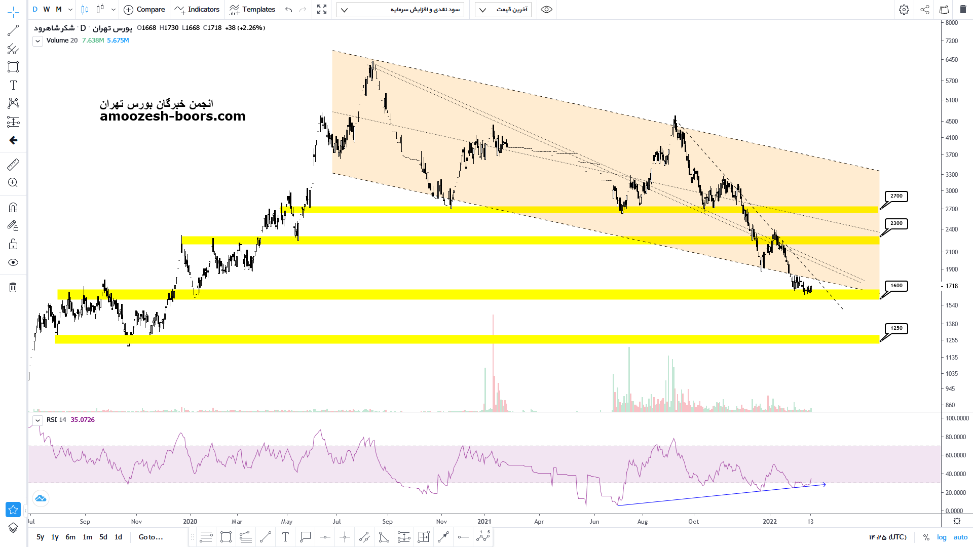 علیرغم گزارشات فوق العاده ی شرکت قند و شکر شاهرود با نماد قشکر اتفاقات خوبی را در چارت شرکت مشاهده نمیکنیم. با توجه به قدرت داشتن فروشندگان کف حمایتی کانال نزولی شکسته شده و پس از پولبک به محدوده حمایتی ۱۶۰ تومان رسیده است که در صورت رشد و شکست محدوده پرتراکم مقاومتی ۱۸۰ تومان الی ۲۰۰ تومان میتواند رشد خود را تا محدوده ۲۲۰ تومان و سپس در صورت شکست تا ۲۷۰ تومان ادامه دهد. اما در صورت شکست محدوده حمایتی ۱۶۰ تومان اصلاح بیشتر تا محدوده حمایتی ۱۲۰ تومان ادامه خواهد داشت