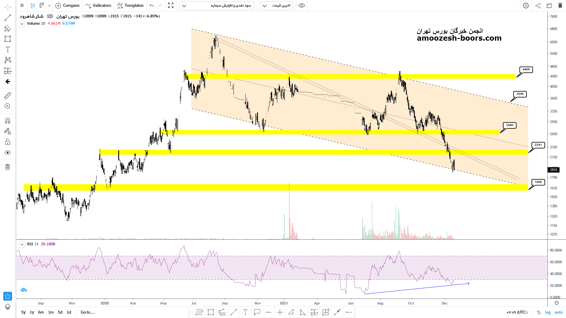 نماد قشکر پس از 70 درصد اصلاح از سقف تاریخی خود درون یک کانال نزولی 16 ماهه، اکنون به محدوده حمایتی کف کانال خود رسیده است که در صورت صعود با توجه به فشردگی مقاومت های مهم در آن محدوده، نسبت ریسک به ریوارد مطلوبی را جهت سرمایه گذاری ارائه نمیکند.