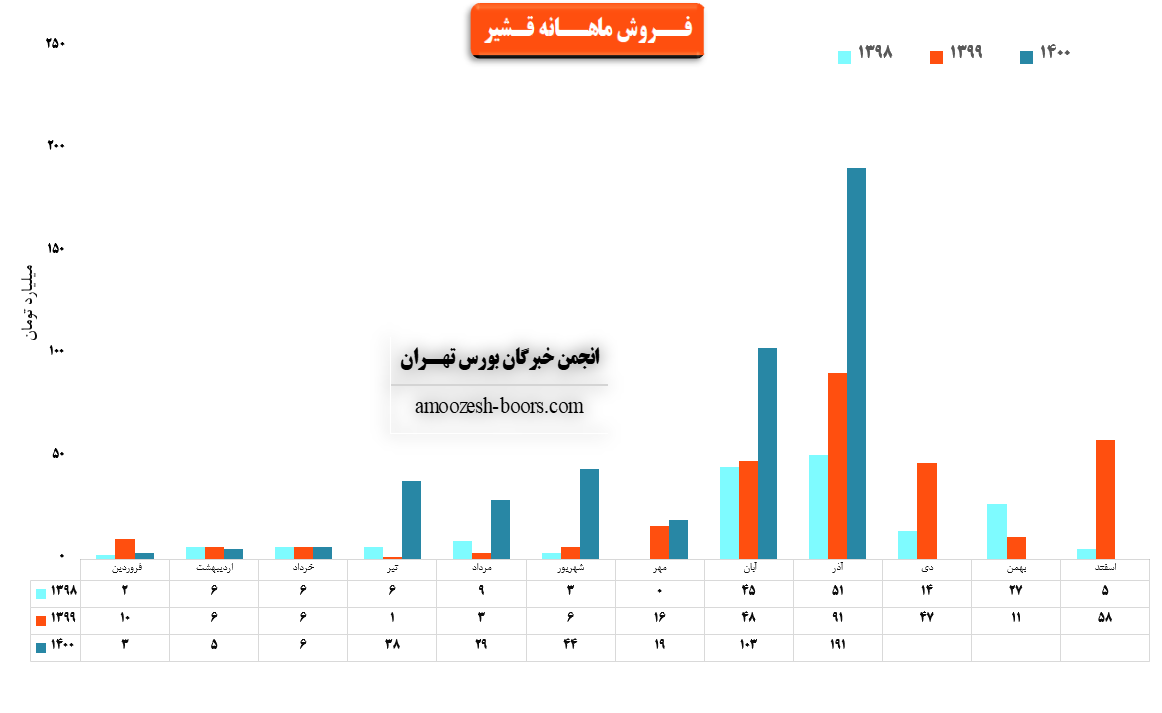 نماد قشیر در مهر 191 ، شهریور 441 ، مرداد 293 میلیارد ریال فروش داشت و طی عملکرد 1 ماهه منتهی به 1400/07/30 نسبت به دوره 1 ماهه مشابه سال قبل 18% افزایش داشته است.