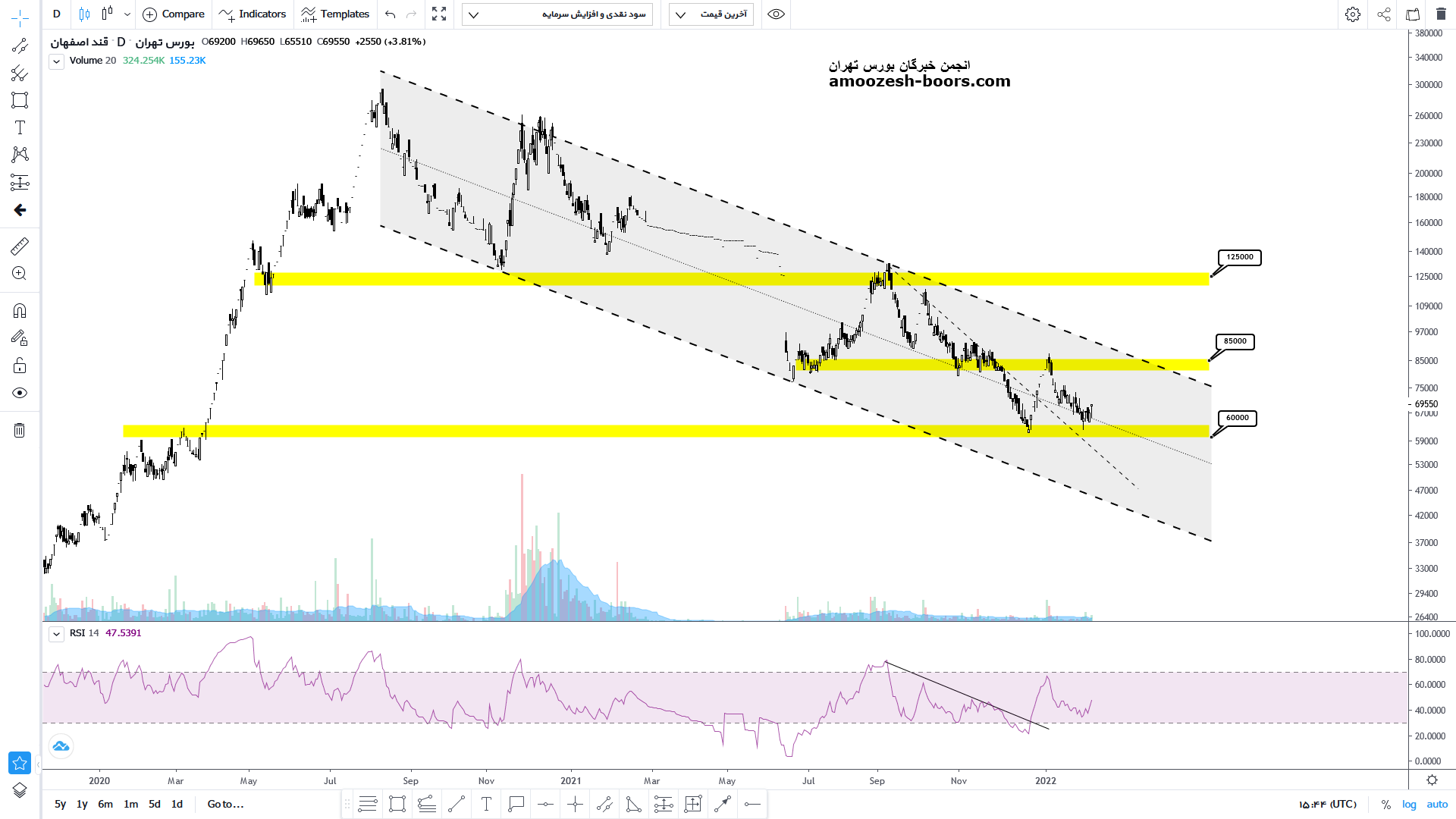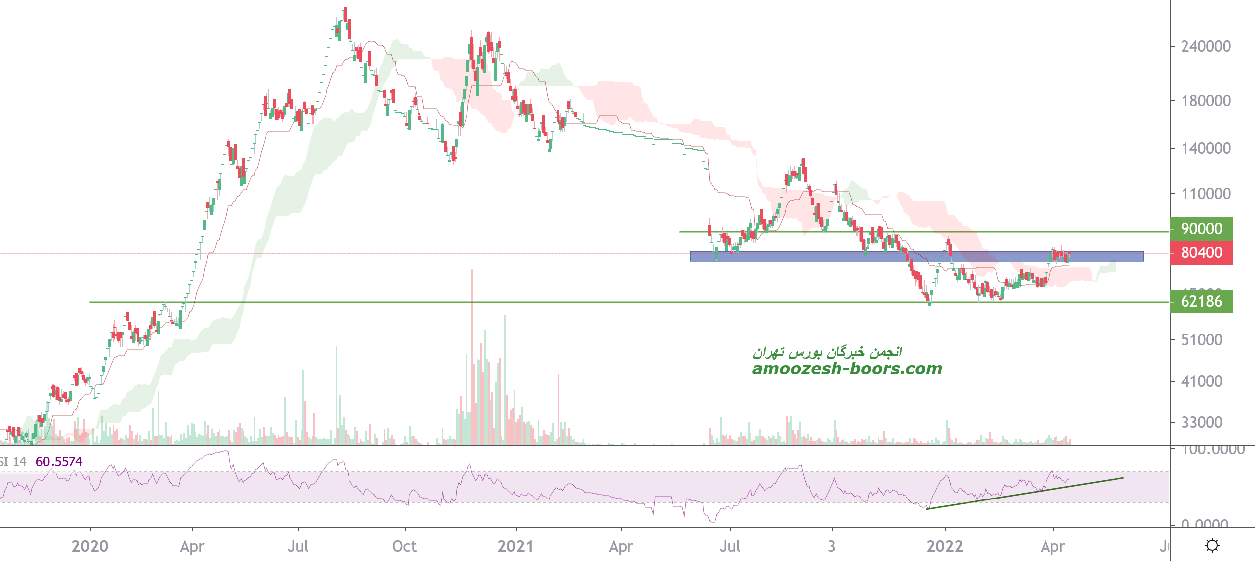 اکنون با نزدیک شدن به محدوده حمایتی مهم 6000 تومان در صورت حمایت از این محدوده میتواند نوسانی رو به بالا تا محدوده سقف کانال (8500 تومان) و درصورت شکست تا محدوده 12500 تومان داشته باشد.