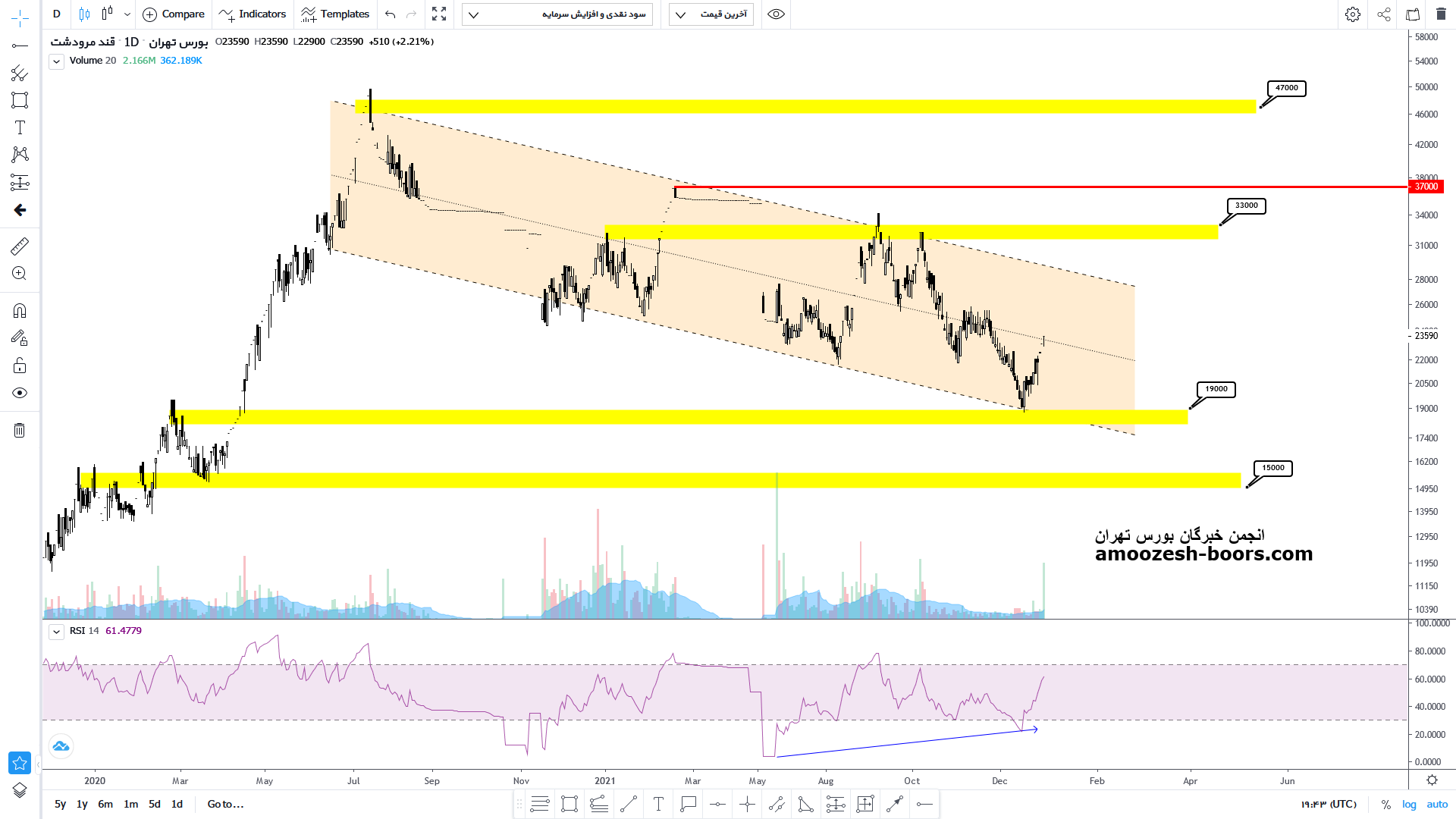 اما در صورت عدم توانایی قیمت در شکست مقاومت میدلاین و بروز واکنش منفی نسبت به این محدوده میتواند تا حمایت کف کانال یعنی محدوده 1900 تومان نزول کند