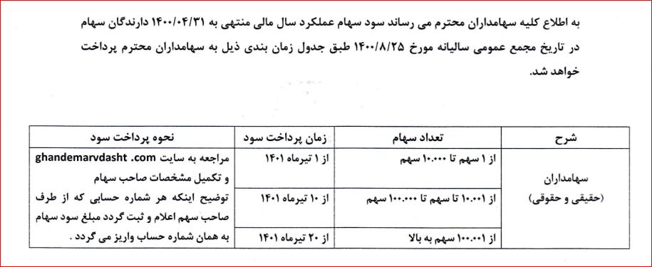 با توجه به برگزاری مجمع سالیانه در تاریخ 25 آبان 1400 سود سهامدارانی که درمجمع سالیانه سهامدار نماد قمرو بودند طبق تصویر زیر پرداخت میشود: