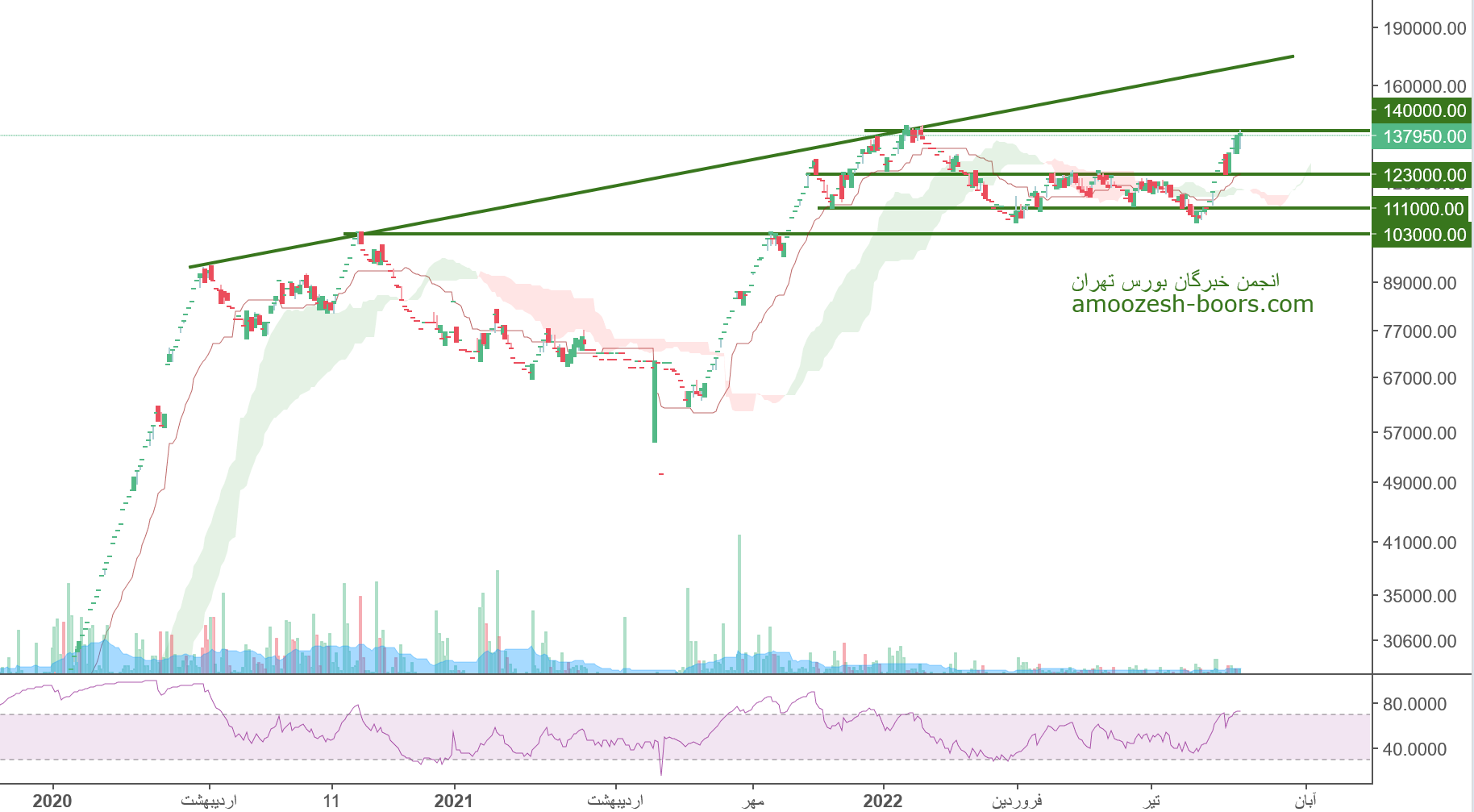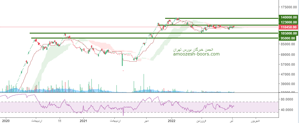 در حال حاضر سهم مقاومت 123000 ریال را دارا میباشد در صورتی که سهم موفق به عبور از این مقاومت شود،مقاومت بعدی 140000 ریال در نظر گرفته خواهد شد،همچنین در صورت اصلاح،حمایت سهم 105000 ریال خواهد بود که در این صورت حد ضرر فعال میگردد.
