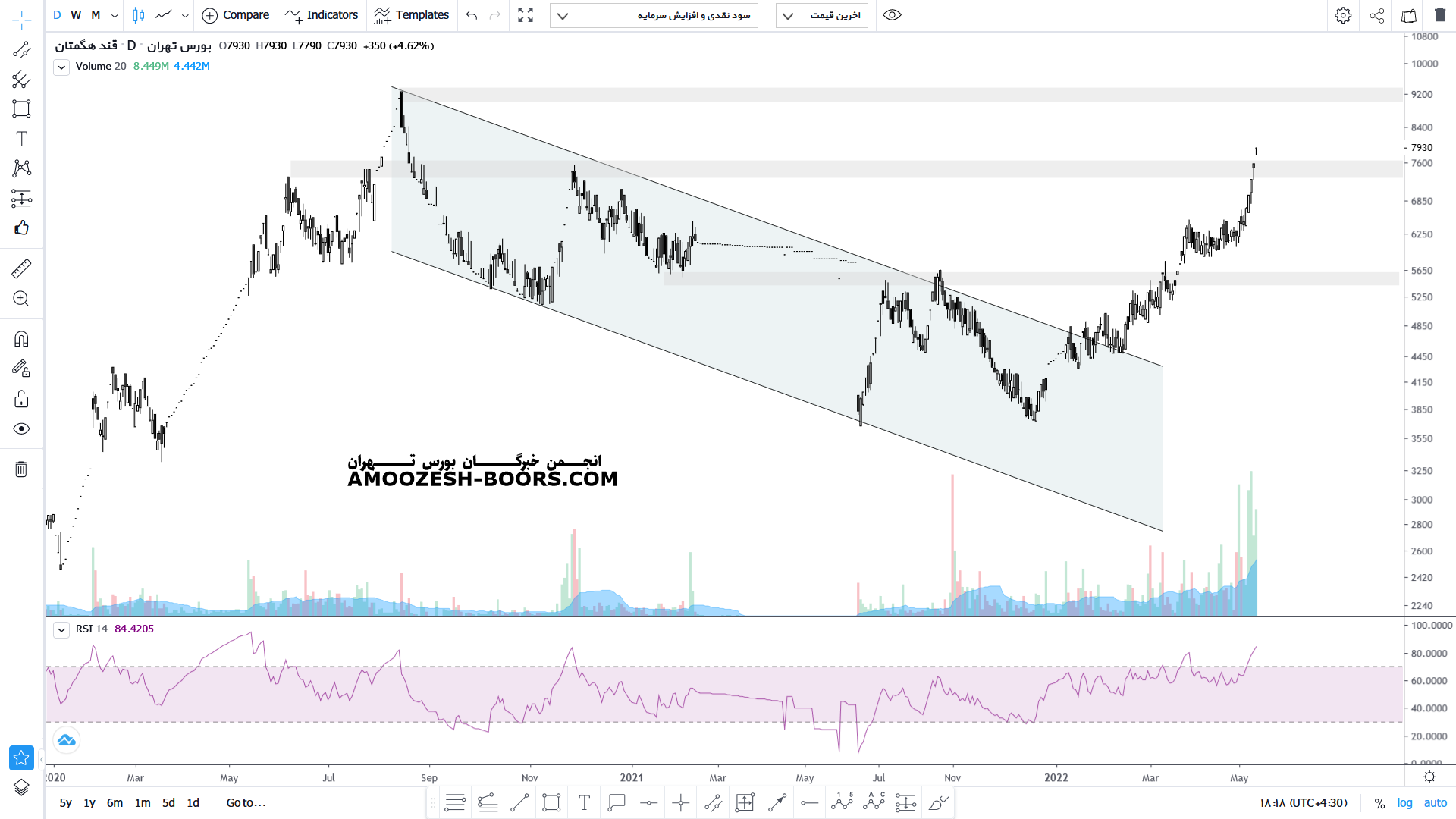 قیمت نماد قهکمت در حال حاضر درگیر مقاومت خط داینامیک صعودی میباشد و در صورت ادامه دار شدن تقاضا و شکستن این مقاومت،مقاومت بعدی 7000 ریال در نظر گرفته خواهد شد و در صورتی که قیمت وارد فاز اصلاحی شود اولین حمایت سهم 5200 ریال خواهد بود که در این صورت حد ضرر سهم برای دوستان کوتاه مدتی فعال خواهد شد.