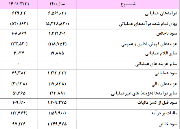 عملکرد شركت براي دوره منتهي به سه ماهه نخست و پايان دوره سال قبل به شرح جدول زير ارايه شده است :