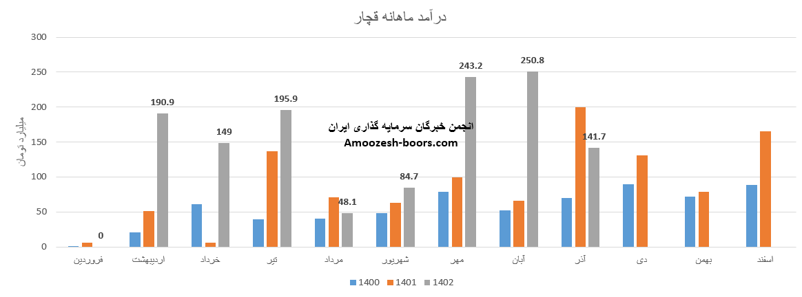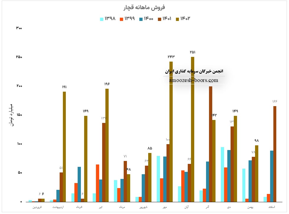 فروش آذر ماه سال 1402 سهم قچار 141.7 میلیارد تومان گزارش شده است، تغییرات درآمدی قچار به شرح زیر میباشد: