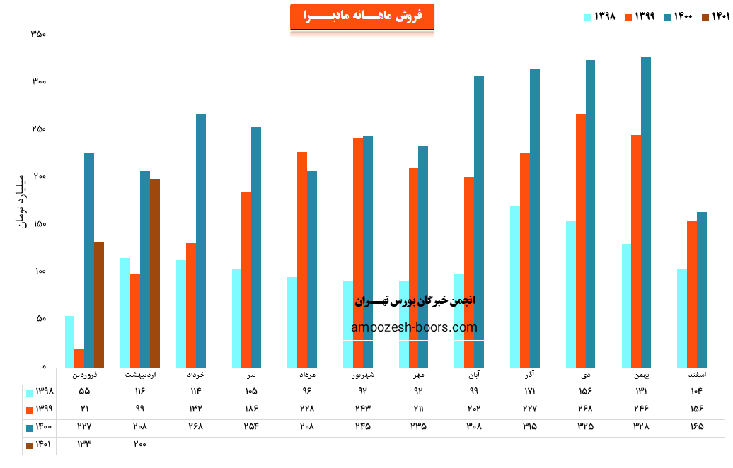 شرکت صنایع مادیران طی عملکرد 1 ماهه منتهی به 1401/01/31 معادل 1,332,104 میلیون ریال از محصولات خود را به فروش رسانده است که نسبت به دوره 1 ماهه مشابه سال قبل 41% کاهش داشته است.