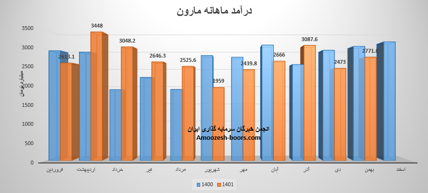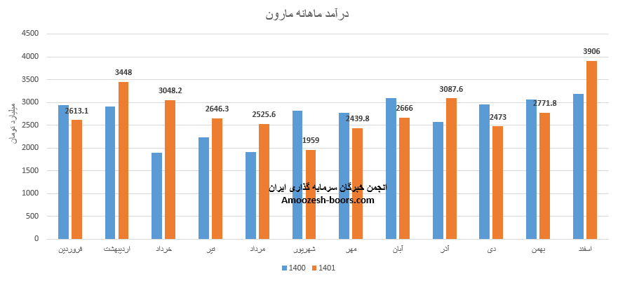 پتروشیمی مارون ( نماد مارون ) با ثبت رکورد جدید 3906 میلیارد تومانی سال مال خود را به پایان رساند، 39% از درآمد اسفند ماه سهم مارون از طریق صادرات، و مابقی از طریق فروش داخلی تامین شده است، رقم درآمد نماد مارون نسبت ماه قبلی 41%، نسبت متوسط ماهانه 45% و نسبت به مدت مشابه 23% رشد داشته است، پلی اتیلن سنگین که بیشترین وزن سبد فروش مارون را تشکیل داده است، نسبت به ماه قبلی رشد 44 درصدی در نرخ و 104 درصدی در میران فروش را تجربه نموده است، مجموع عملکرد 12 ماهه سهم مارون 4% نسبت به مدت مشابه رشد داشته است.