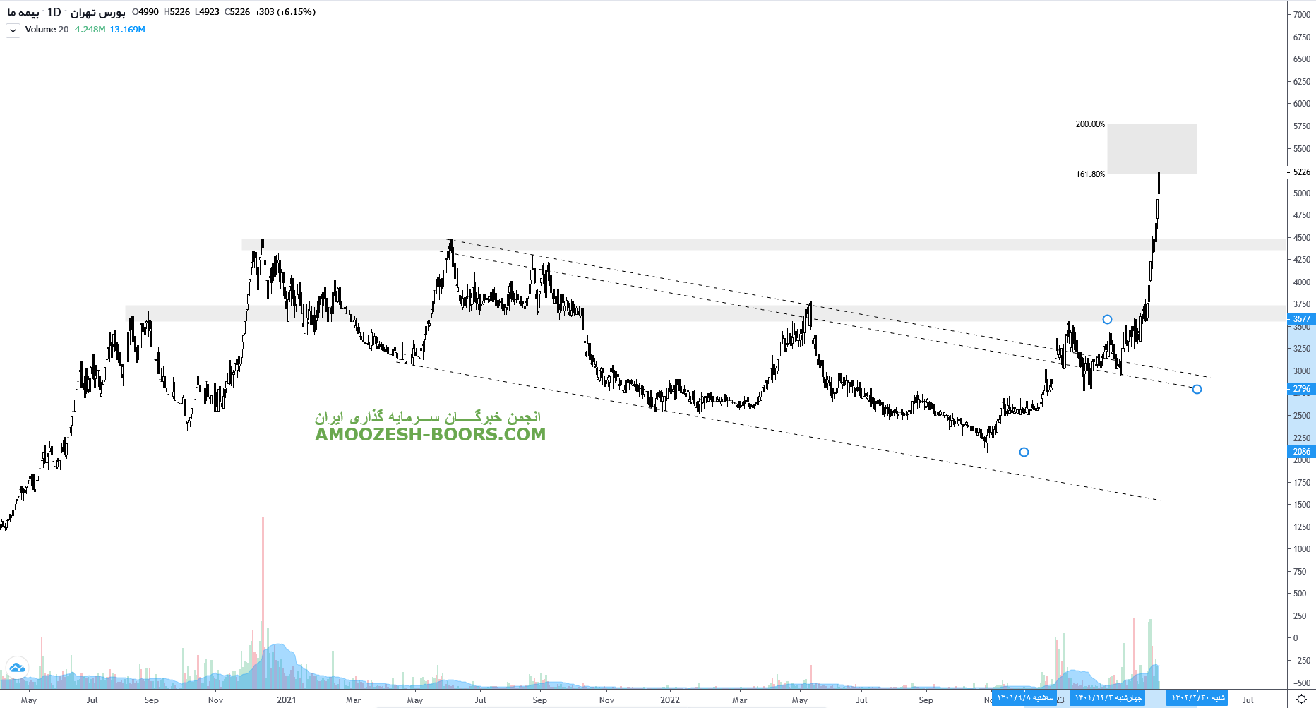 قیمت نماد ما ( بیمه ما ) حمایت موینگ در محدوده 4500 ریال را دارا میباشد، در صورت تبیت قیمت، حرکت سهم ما تا 5700 ریال و بعد از آن 7000 ریال دور از ذهن نخواهد بود، همچنین در صورت از دست رفتن محدوده حمایتی ذکر شده، حمایت بعدی 3500 ریال در نظر گرفته خواهد شد.