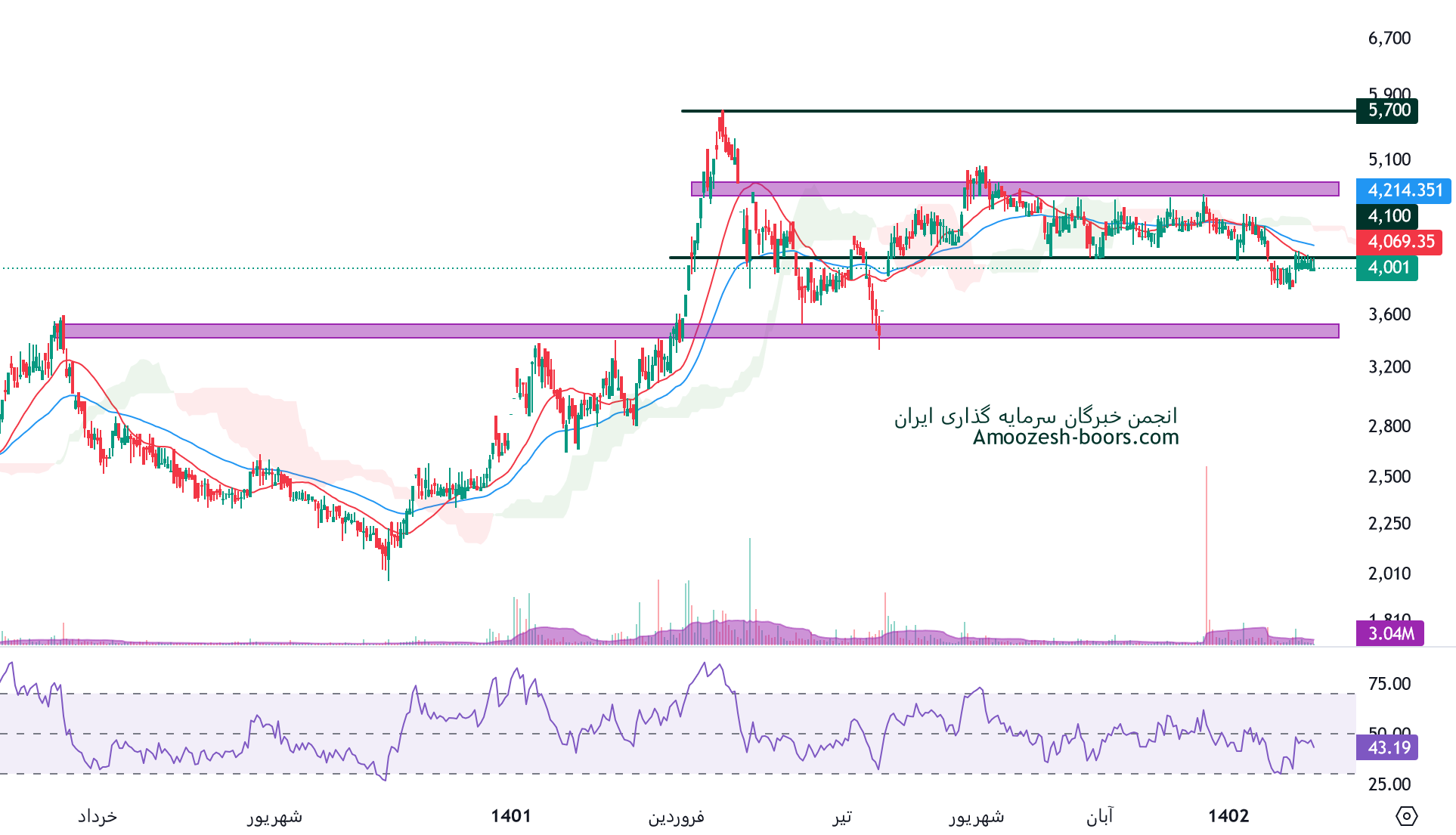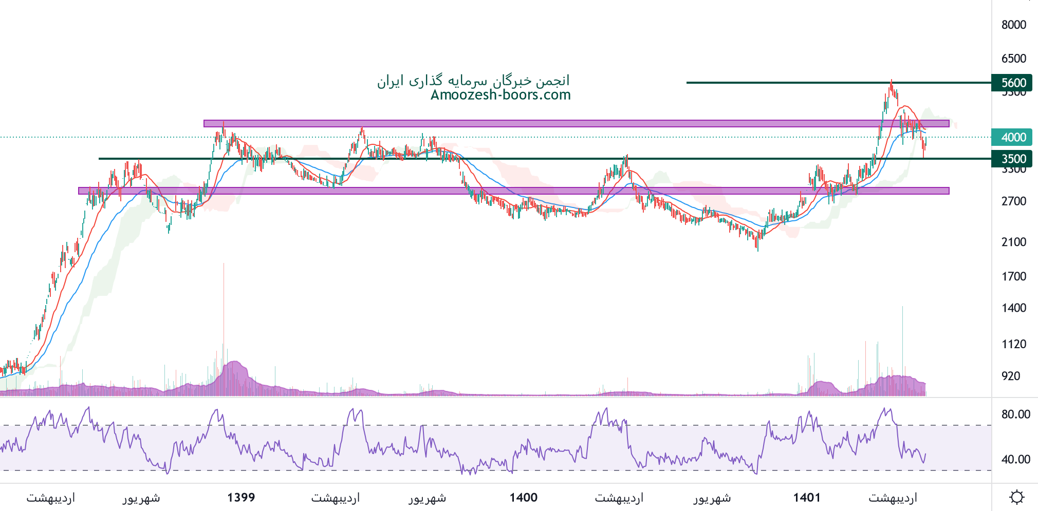 حمایت ما سطح 3500 ریال تعیین شده که قیمت سهم به سطح واکنش مثبت نشان داده و در حال حاضر مابین این محدوده و محدوده مقاومتی 4000 ریال در حال نوسان میباشد، در صورت ادامه دار شدن اصلاح قیمت سهم ما، حمایت بعدی محدوده 3000 ریال ارزیابی میگردد، که این تاحیه برای ورود پله ای محدوده کم ریسکی خواهد بود.