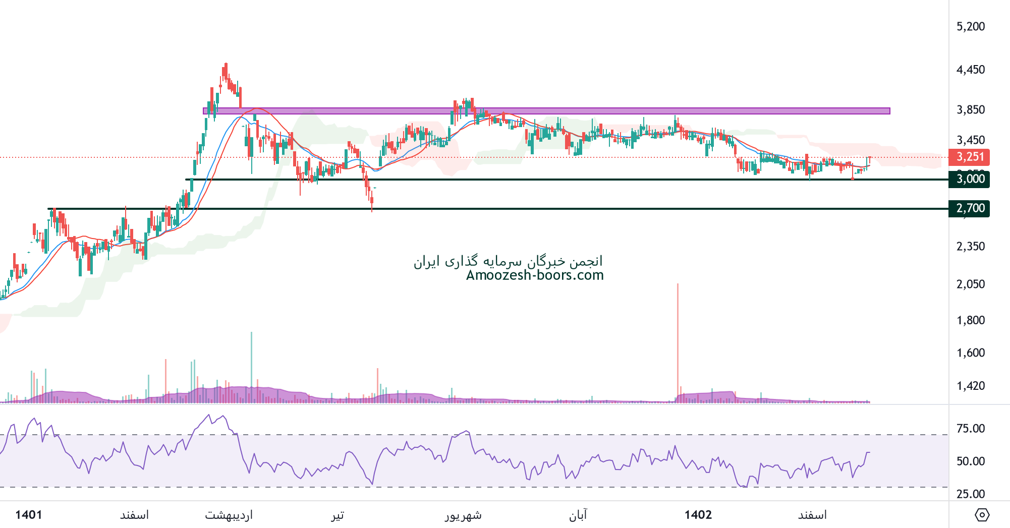 بعد از اصلاحی که روی چارت انجام شده قیمت به محدوده امنی رسیده است، محدوده حمایت ما محدوده 3000 ریال ارزیابی میگردد، در صورت تثبیت قیمت در این محدوده و ثبت کندل های مثبت، میتوان انتظار حرکت قیمت تا محدوده 4000 ریال را داشت، همچنین در صورت ادامه دار شدن اصلاح و از دست رفتن حمایت نماد ما که در بالا ذکر شد، حمایت بعدی 2700 ریال خواهد بود.