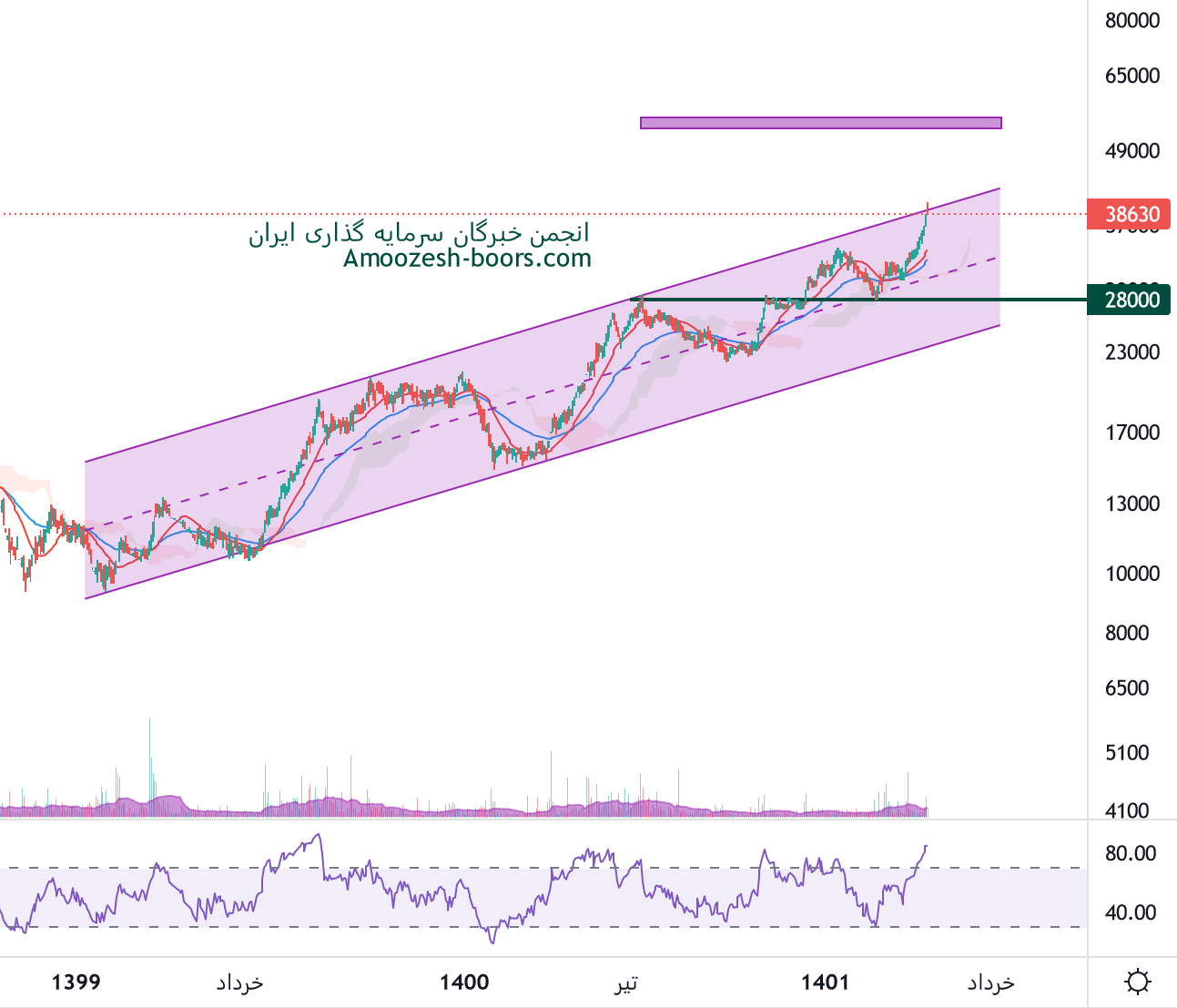 روند حرکتی نماد مبین صعودی است و قیمت در حال حاضر درگیر مقاومت سقف کانال میباشد و تارگت سهامداران کوتاه مدت خود را تست نموده است، با توجه به موقعیت فعلی قیمت و ریسک بالای چارت در صورت ایجاد نشانه های برگشتی پیشنهاد به سیو سود داده میشود، بهترین محدوده ورود سهم مبین پس از تکمیل اصلاح تا ناحیه میدلاین کانال ( 33000 ریال) و یا تثبیت بالای کانال صعودی میباشد، در صورت عبور قیمت از سقف کانال تارگت قیمت 55000 ریال ارزیابی میگردد.