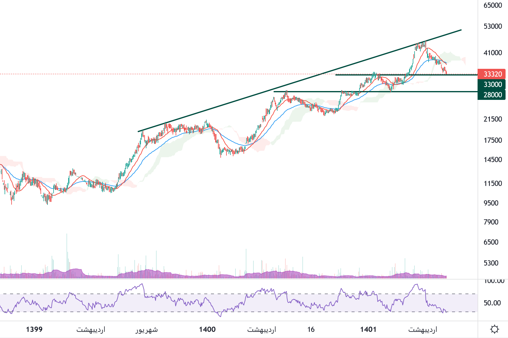 نماد مبین در ادامه اصلاح خود به سطح حمایتی 33000 ریال رسیده در صورت تثبیت قیمت در این سطح، حرکت سهم مبین تا محدوده 50000 ریال محتمل خواهد بود، همچنین در صورت شدت گرفتن فشار عرضه و از دست رفتن سطح حمایتی مذکور، حمایت بعدی سهم 28000 ریال در نظر گرفته خواهد شد.