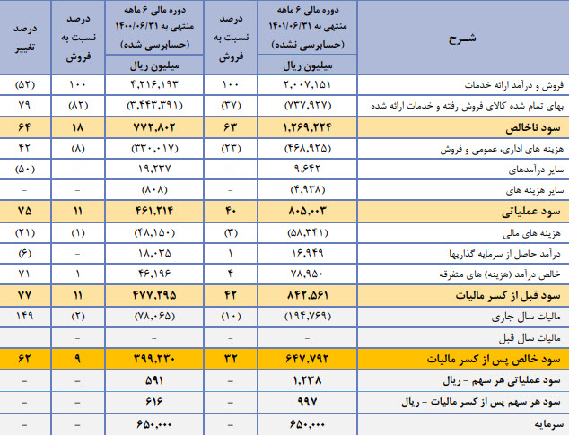 سهم مداران تا پایان شهریور ماه عمدتاً به دلیل عدم برگزاری مناقصات توفیق چندانی در انعقاد قراردادهای فروش تجهیزات نداشته ولی به دلیل انعقاد قرارداد جدیدی در حوزه نرم افزارهای کاربردی با حاشیه سود مناسب باعث گردید سود پیش بینی شده را پوشش دهد. سایر تغییرات با اهمیت دوره به شرح زیر میباشد :