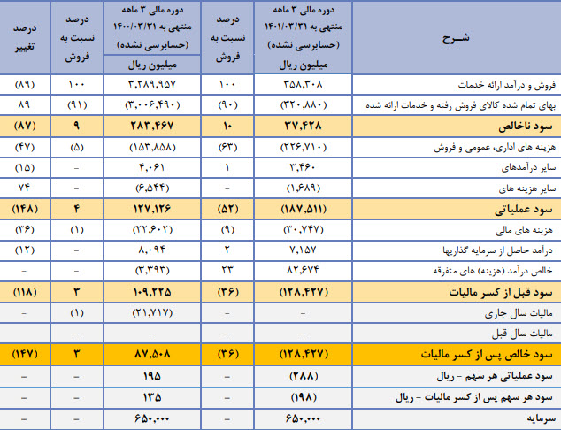 همچنین شرکت اعلام داشته تعدادی از قراردادها فی مابین شرکت با یکی از مشتریان در اواخر سال 1400 خاتمه یافته اما به دلیل عدم توافق در میزان افزایش مبلغ، این قراردادها تاکنون نهایی نشده است صورتحساب قراردادهای مذکور به محض نهایی شدن قراردادهای مربوطه صادر و درآمد آن در دفاتر شناسایی خواهد شد. میزان خدمات ارائه شده بر اساس نرخ قرارداد سال قبل مبلغی در حدود 160000 میلیون ریال می باشد.