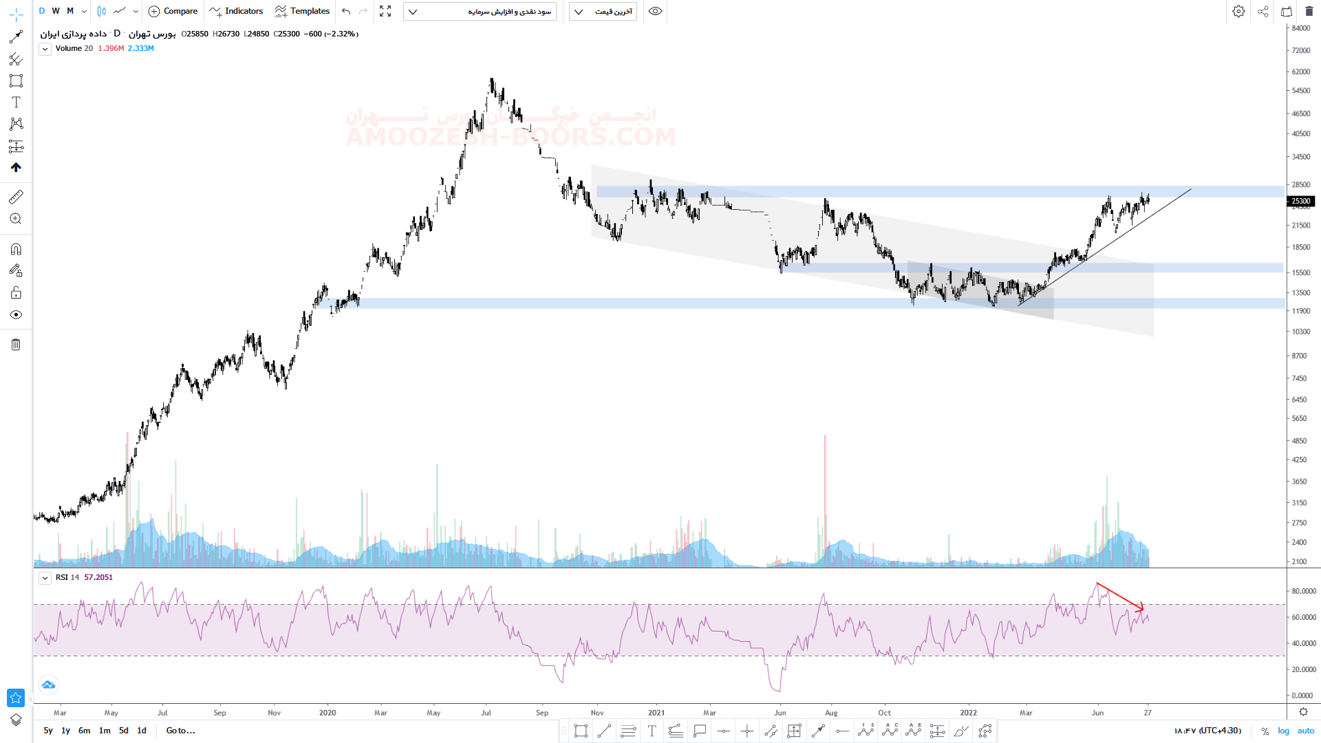 قیمت سهم مداران پس از برخورد به ناحیه مقاومتی سقف ۲۷۰۰ تومان با ایجاد واگرایی منفی در تست دوباره این ناحیه مقاومتی نظر اصلاحی را در پیش دارد لذا محدوده حمایتی ۱۶۰۰ تومان و در صورت شکست محدوده حمایتی ۱۲۰۰ تومان می تواند سد راه قیمت از ریزش بیشتر شوند. در صورت شکست مقاومت ناحیه 2700 تومان قیمت پتانسیل رشد تا سقف تاریخی خود را نیز دارد.