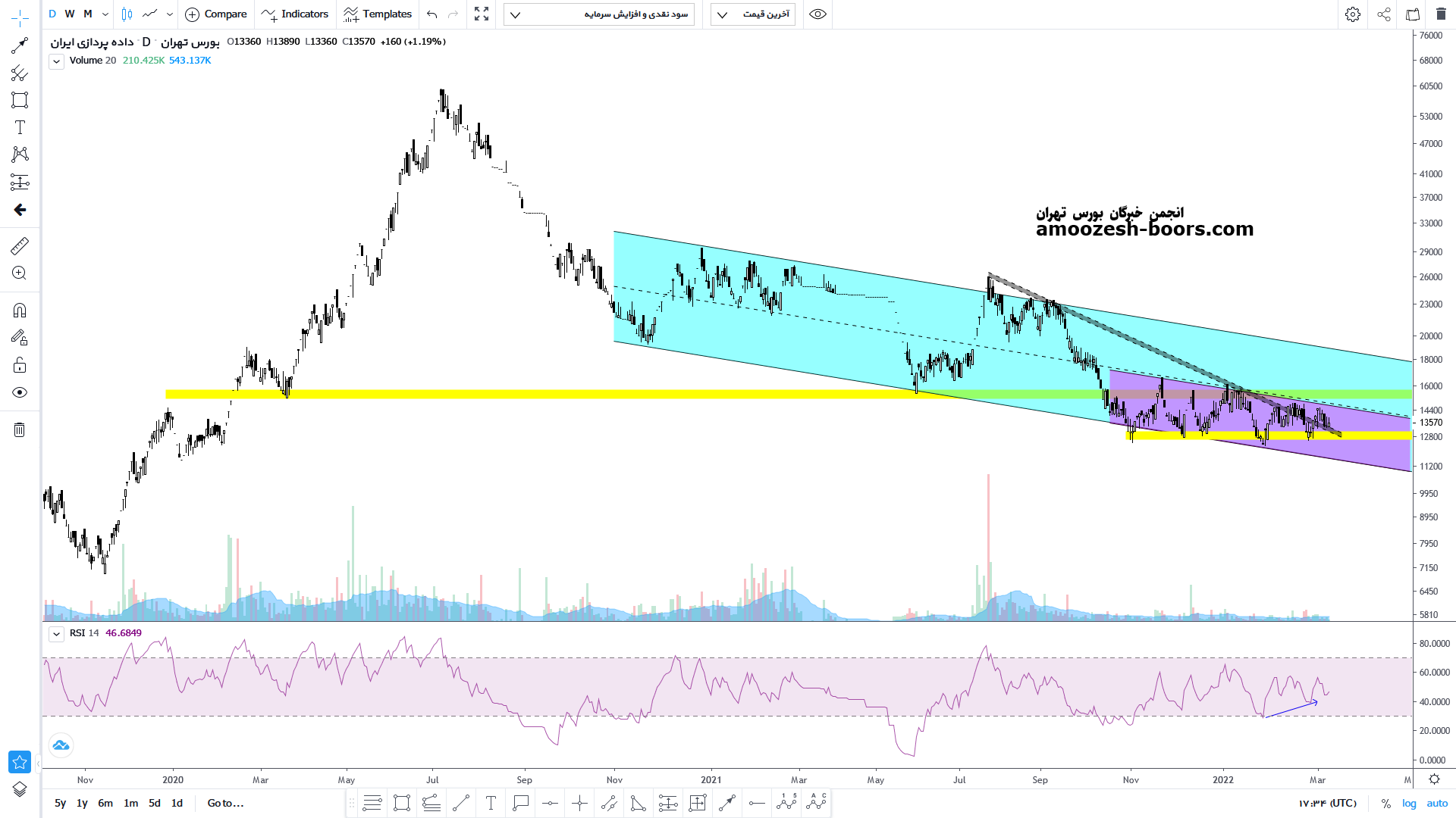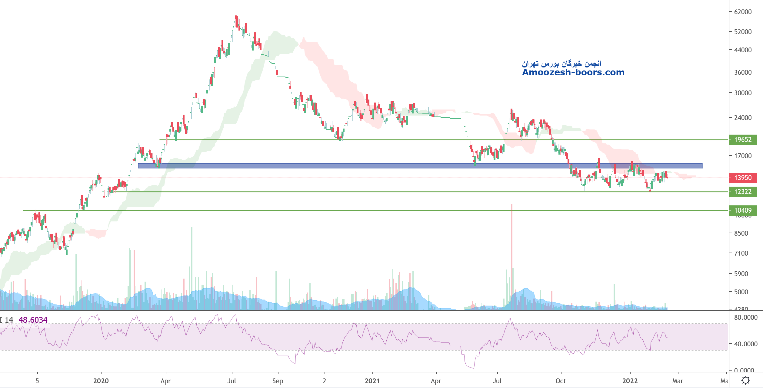 با توجه به قرارگیری قیمت درون یک کانال نزولی درازمدت و یک کانال نزولی کوتاهمدت و همچنین حفظ شدن محدوده حمایت کلاسیک ای ۱۳۰۰ تومان و ایضا با توجه به شکست خط روند نزولی سهم انتظار رشد تا محدوده مقاومتی سقف کانال یعنی محدوده ۱۵۰۰ تومان از سهم داریم که در صورت شکست این محدوده مقاومتی پرتراکم میتواند رشد خود را تا محدوده سقف کانال نزولی درازمدت نیز یعنی محدوده ۱۹۰۰ تومان ادامه دهد. اما در صورت برگشت مجدد و شکست محدوده حمایتی مهم ۱۳۰۰ تومان انتظار ریزش بیشتر تا محدوده کف دو کانال خود را داریم.