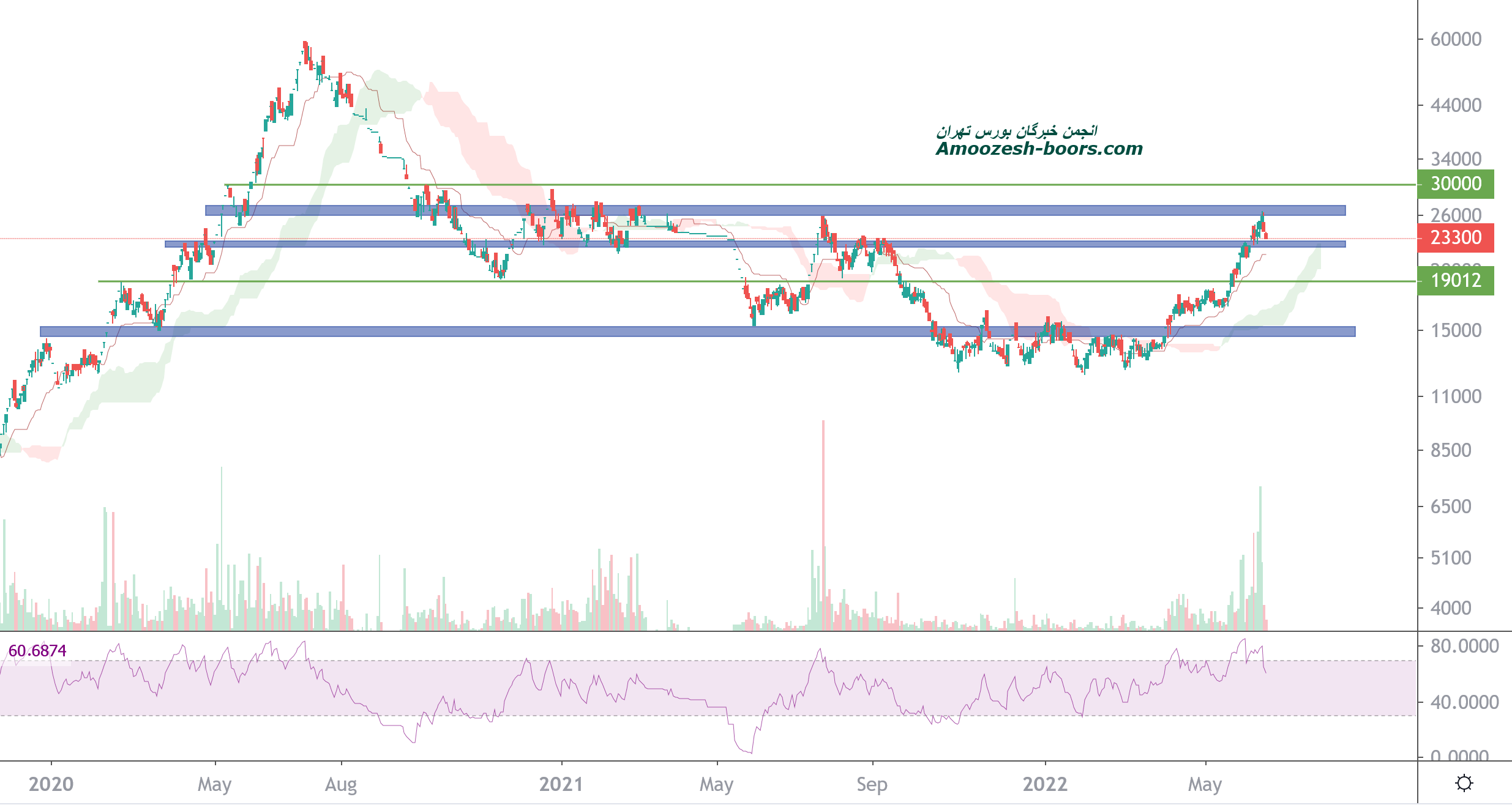 در حال حاضر قیمت در محدوده حمایتی 22500 ریال و مقاومتی 27000 ریال میباشد در صورت ادامه دار شدن فشار تقاضا و عبور از این مقاومت تارگت سهم 30000 ریال در نظر گرفته خواهد شد،همچنین در صورت از دست رفتن حمایت،حمایت بعدی 19000 ریال خواهد بود که در این صورت حد ضرر فعال خواهد شد.