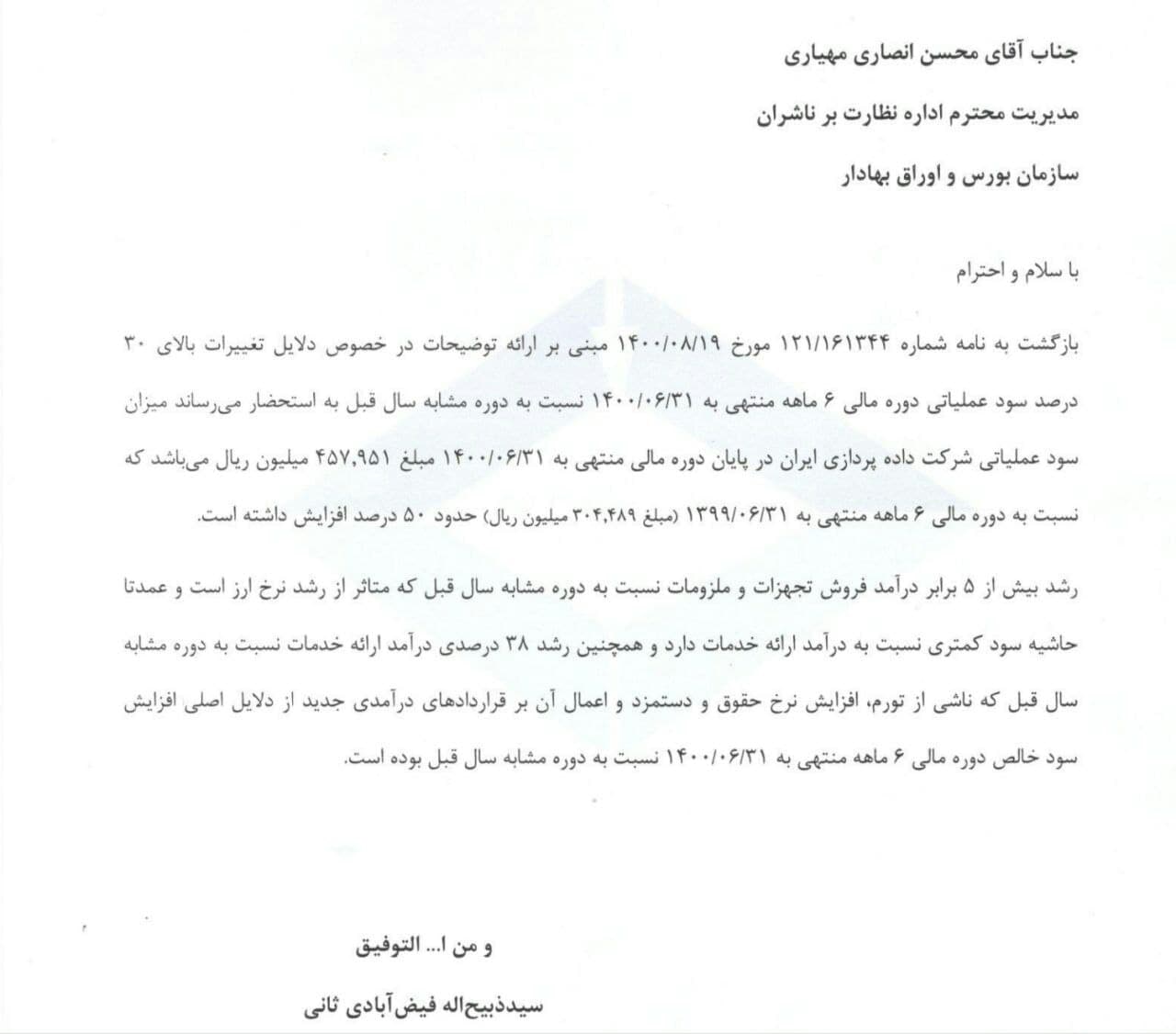 شرکت نسبت به دوره 1 ماهه مشابه سال قبل 25% کاهش درآمد داشته است.با توجه به افزایش 60 درصدی ای پی اس و رشد 220 درصدی درآمد عملیاتی در گزارش میان دوره ای سهم دلايل اصلي افزايش سود خالص دوره گزارش شده نسبت به دوره مشابه سال قبل را طی نامه زیر افشا نموده است .همچنین باید در نظر داشت هزینه های مالی 730 درصد رشد داتشه است .