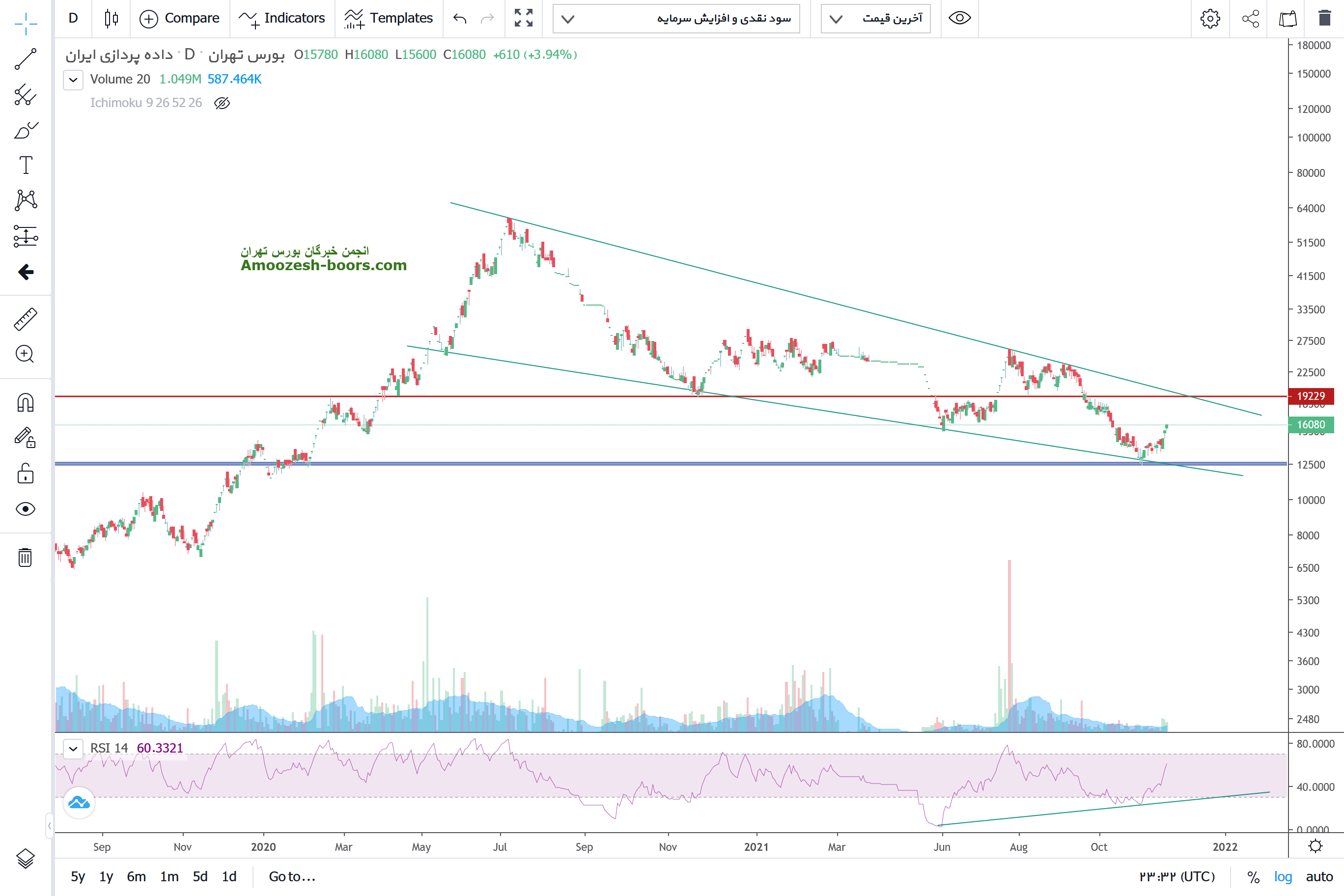سهم با ایجاد واگرایی مثبت در محدوده کف کانال واکنش مثبتی نشان داده و میتواند نوسان مثبتی داشه باشد مقاومت های 15500 و 18500 بر سر راه حرکتی سهم قرار دارند .