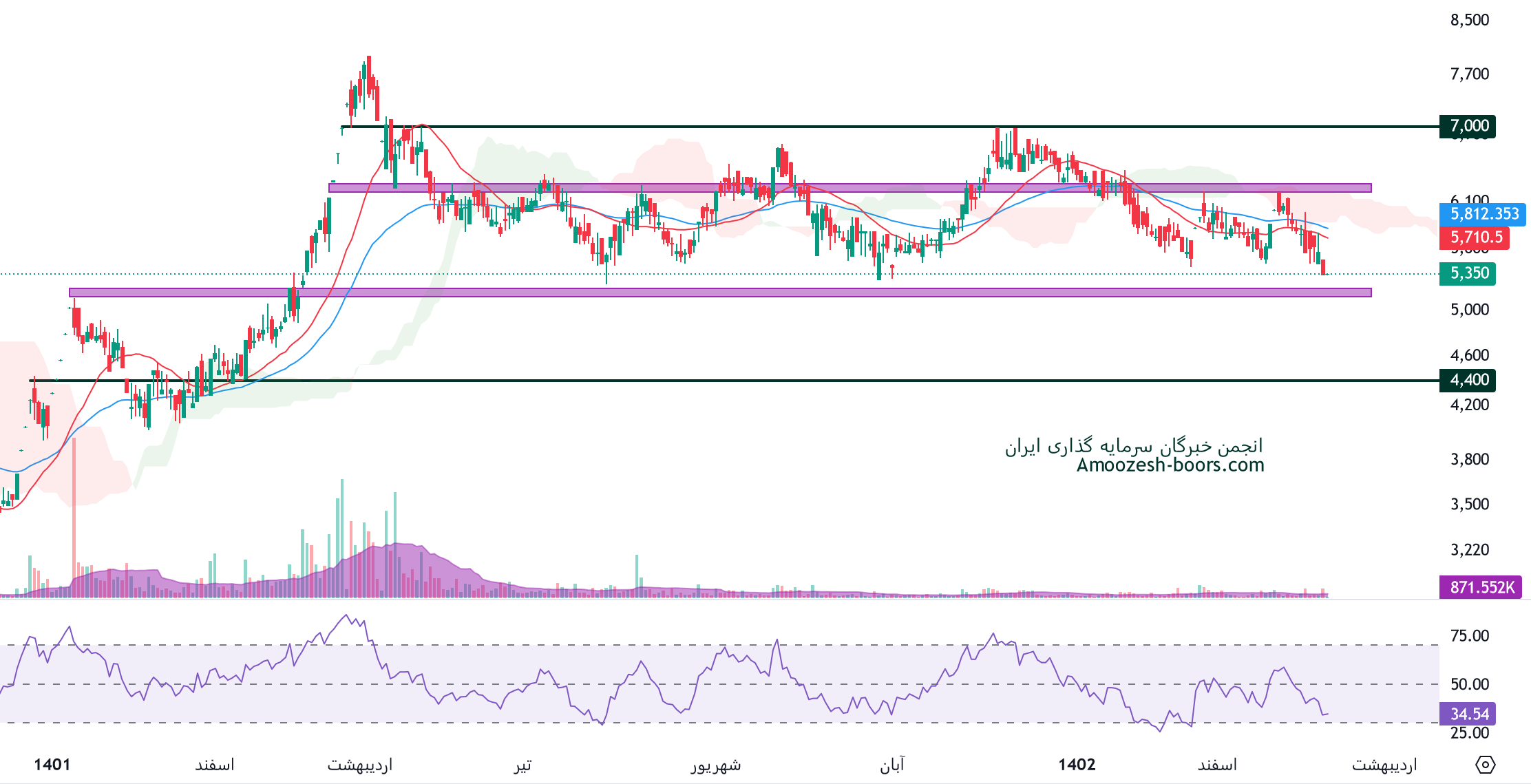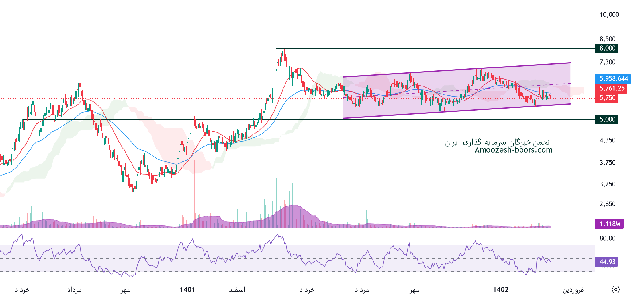 همانطور که در تحلیل تکنیکال مداران میبینیم قیمت در محدوده حمایتی 5500 ریال و محدوده مقاومتی 6400 ریال در حال نوسان میباشد.