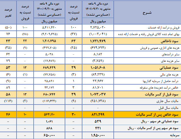 فروش شرکت: 841 میلیارد تومان که نسبت به دوره مشابه گذشته 24% افزایش یافته است.
