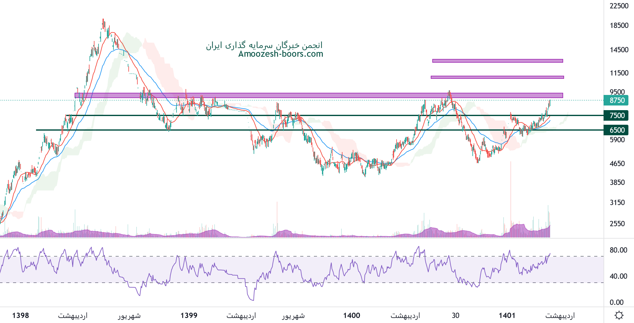 نماد مداران محدوده مهم مقاومتی 9500 ریال را پیش رو دارد، در صورت عبور از این محدوده، تا تارگت محدوده 13000 ریال مقاومت 11000 ریال بر سر راه سهم قرار دارد، همچنین در صورت ورود سهم به فاز اصلاحی، اولین حمایت 7500 ریال در نظر گرفته خواهد شد.