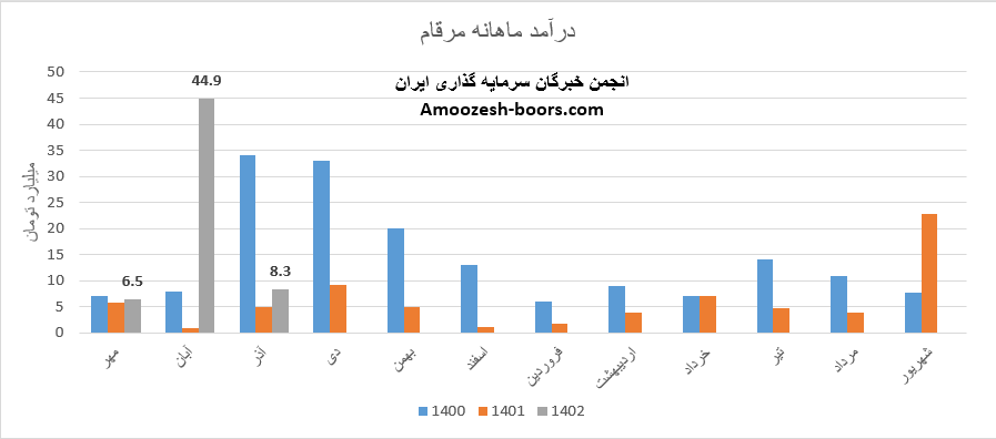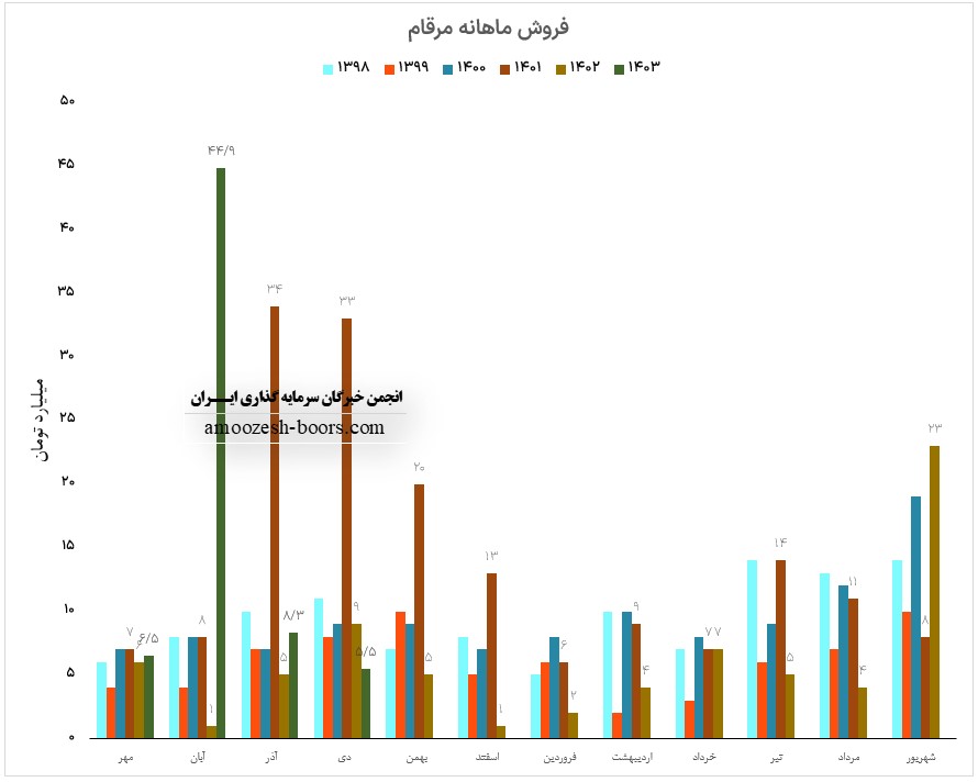 فروش آذر ماه سال 1402 سهم مرقام 8.3 میلیارد تومان گزارش شده است، تغییرات درآمدی مرقام به شرح زیر میباشد: