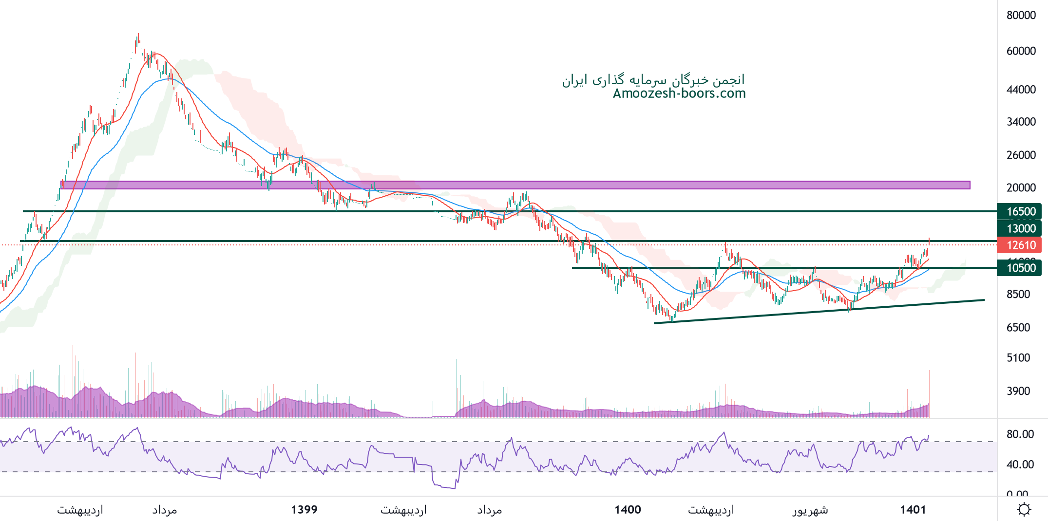 نماد مرقام درگیر سطح مقاومتی 13000 ریال میباشد، در صورتی که قیمت مرقام موفق به عبور از این سطح شود، مقاومت بعدی را 16500 ریال در نظر میگیریم، همچنین در صورتی که سهم وارد فاز اصلاحی شود، اولین حمایت سهم مرقام 10500 ریال خواهد بود.