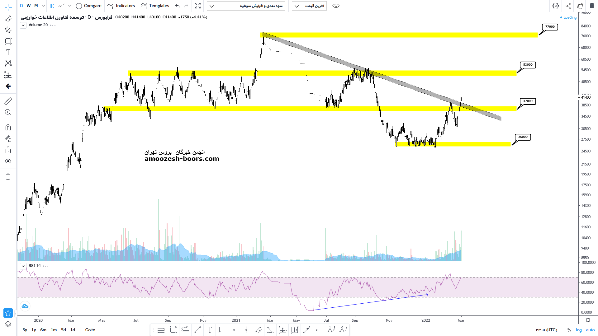 مفاخر با ایجاد واگرایی مثبت در محدوده حمایت استاتیک در حال بیس سازی میباشد در صورت از بین رفتن این حمایت حد ضرر فعال خواهد شد و در صورت تثبیت مقاوت های 30 ، 37 و 54 هزار ریال بر سر راه سهم وجود دارد .