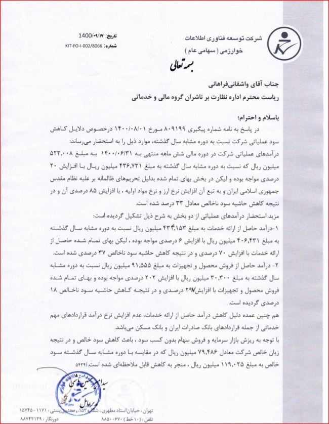 شرکت در خصوص دلايل کاهش سود عملياتي و سود خالص شرکت دوره شش ماهه 1400 نسبت به دوره مشابه سال گذشته در طی یک نامه ای توضیحات را ارائه داده است: