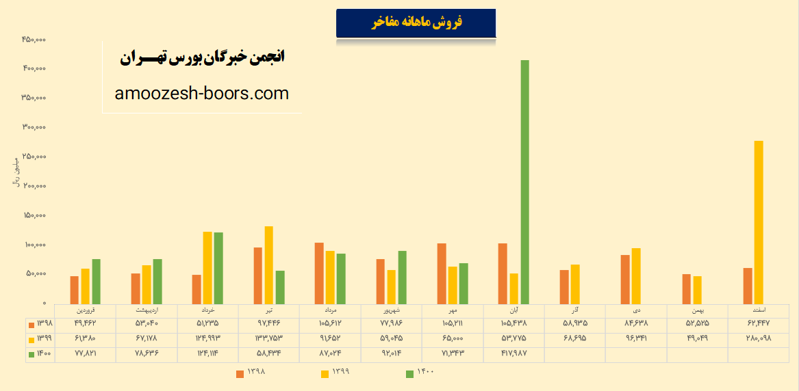 مفاخر در ماه گذشته 41.8 میلیارد تومان فروش داشته است که نسبت به ماه گذشته 677% و نسبت به مدت مشابه گذشته 486% افزایش ثبت شده است
