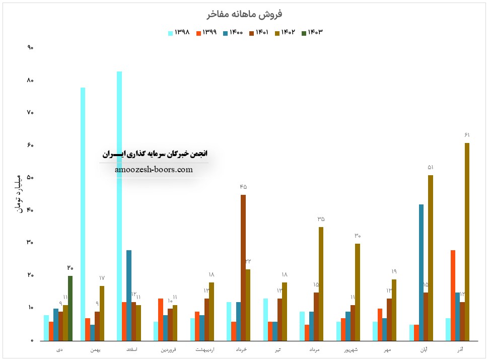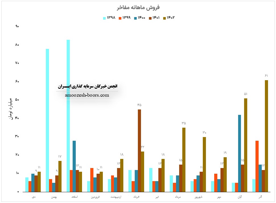 فروش آذر ماه سال 1402 سهم مفاخر 60.9 میلیارد تومان گزارش شده است، تغییرات درآمدی مفاخر به شرح زیر میباشد: