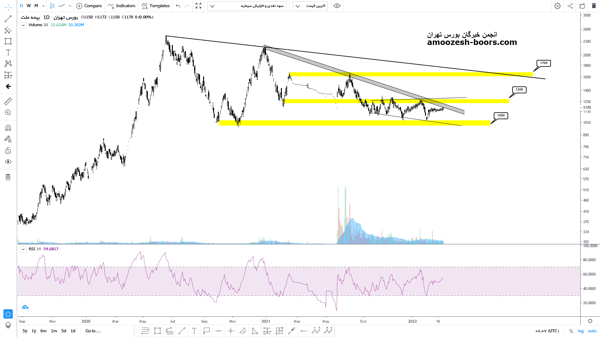 قیمت پس از رشد از محدوده حمایتی ۱۰۰ تومان اکنون به محدوده خط روند نزولی خود رسیده است که در صورت شکست این محدوده میتواند با برخورد به محدوده مقاومتی ۱۳۰ تومان پولبکی را به این خط روند نزولی شکسته داشته باشد. تا بعد از تایید پولبک به سمت محدوده مقاومتی ۱۷۰ تومان حرکت کند اما در صورت بروز واکنش منفی به خط روند نزولی خود می تواند مجددا محدوده حمایتی ۱۰۰ تومان را که یک محدوده حمایتی قوی می باشد تست کند.