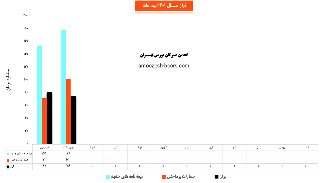 شرکت بیمه ملت با نماد ملت در اردیبهشت ماه سال 1401 حدود مبلغ 178 میلیارد تومان بیمه نامه جدید صادر کرده که این میزان در مقایسه با ماه گذشته 16% افزایش پیدا کرده است.