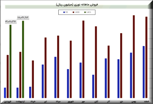 نماد نوری در اردیبهشت فروش فوقالعاده 78.042 میلیارد ریالی را ثبت کرده است. این مقدار در فروردین سال جاری و مدت مشابه سال گذشته 74.028 و 46.714 میلیارد ریال گزارش شده بود و نسبت به دوره 1 ماهه مشابه سال قبل 67% افزایش داشته است.