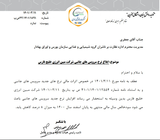 همچنین شرکت طی نامه زیر از افزايش نرخ جديد سرويس هاي جانبي خبر داد که باعث مي شود سودخالص سال مالي منتهي به پايان اسفند سال 1400 به ميزان 8 درصد كاهش يابد.