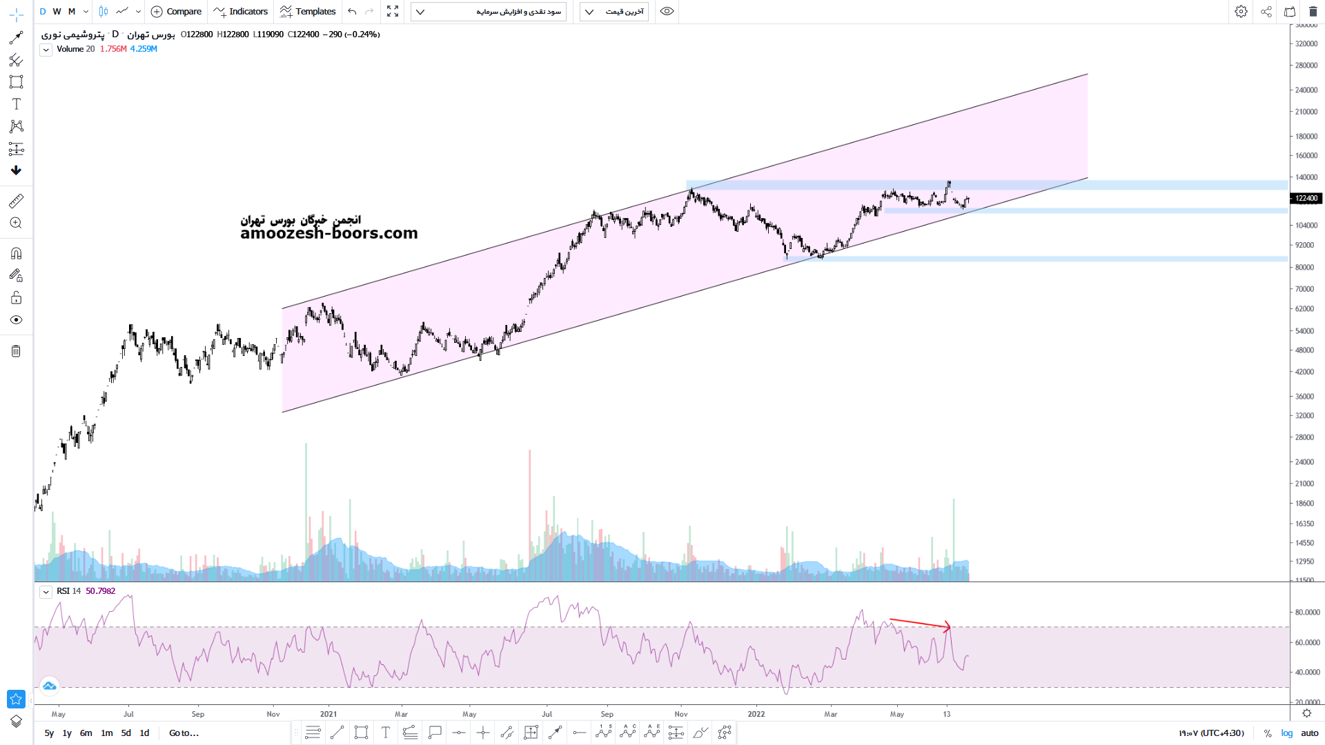 قیمت نماد نوری پس از برخورد به مقاومت محدوده ۱۳,۵۰۰ تومان با بروز واکنش منفی نسبت به این محدوده مقاومتی وارد فاز اصلاحی شده است که محدوده حمایتی کف کانال صعودی دراز مدت خود را پیش روی خود دارد که در صورت حمایت می تواند مجددا به این محدوده مقاومتی نزدیک شود اما در صورت شکست و از دست دادن این محدوده حمایتی می تواند اصلاح خود را تا محدوده حمایتی 8500 تومان نیز ادامه دهد.