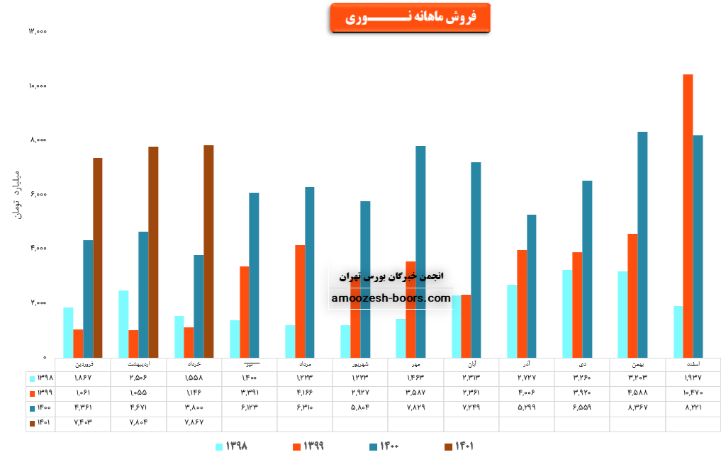 سهم نوری در تیر ماه فروش 81.809 میلیارد ریالی را ثبت کرده است که نسبت به دوره 1 ماهه مشابه سال قبل 34% و نسبت به ماه گذشته 5 درصد افزایش داشته است همچنین فروش این ماه نسبت به میانگین فروش ماهانه 5 درصد بیشتر بوده است.