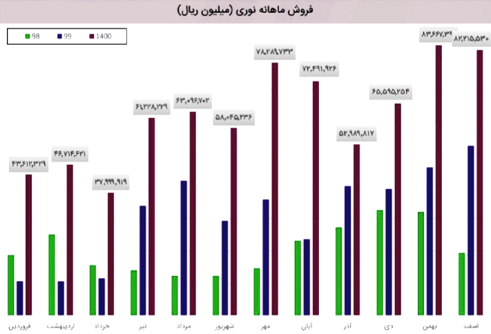 سهم نوری در دی ماه نیز فروش عالی 65.595 میلیارد ریالی را ثبت کرده است. این رقم 3 درصد کمتر از میانگین درآمد فصل پاییز و اما 23 درصد بیشتر از فروش ماه گذشته است.مقدار فروش شرکت از 330 هزار تن به 395 هزار تن رسیده است که نشاندهنده افزایش 20 درصدی مقدار فروش شرکت است.